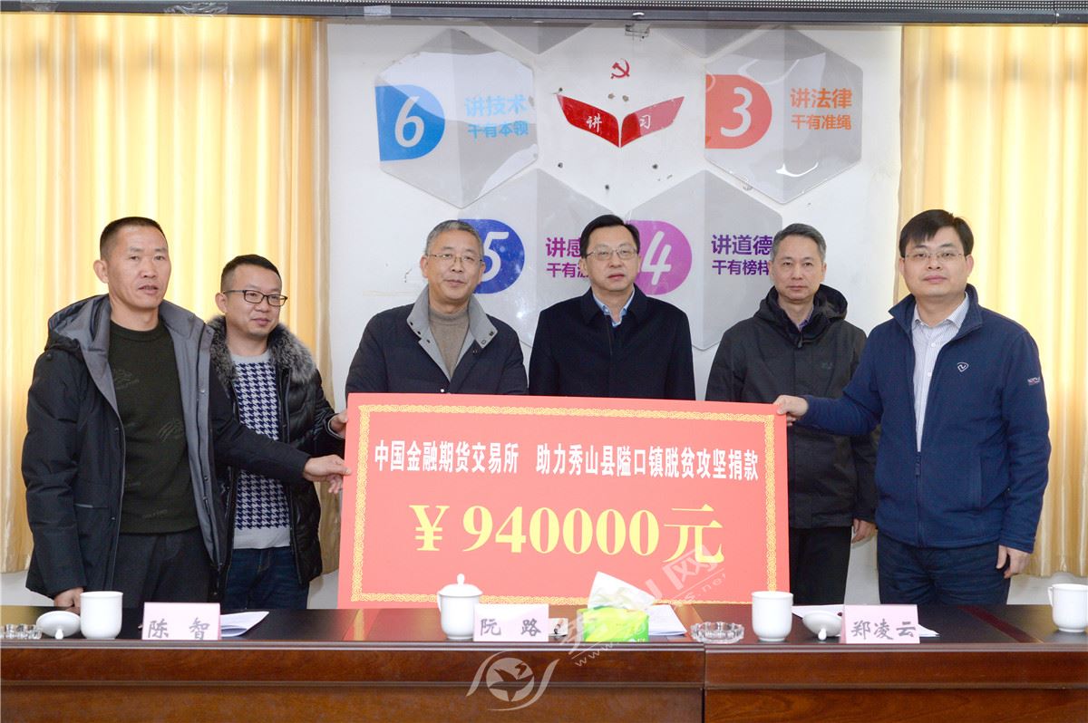 隨后召開了市金融監管局、中金所助力隘口鎮脫貧攻堅工作座談會暨項目資金捐贈儀式。捐贈儀式上,中國金融期貨交易所向隘口鎮捐贈扶貧資金94萬元。