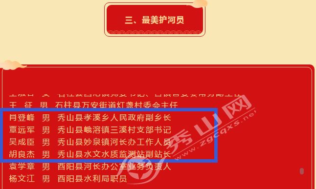 秀山網(wǎng)訊 近日,重慶市2020年度“助推綠色發(fā)展 建設(shè)美麗長江”勞動和技能競賽評選結(jié)果揭曉。孝溪鄉(xiāng)人民政府副鄉(xiāng)長肖登峰、峨溶鎮(zhèn)三溪村支部書記覃遠軍、妙泉鎮(zhèn)河長辦工作人員吳成臣、縣水文水質(zhì)監(jiān)測站副站長胡良杰等4名同志獲評重慶“最美護河員”。
