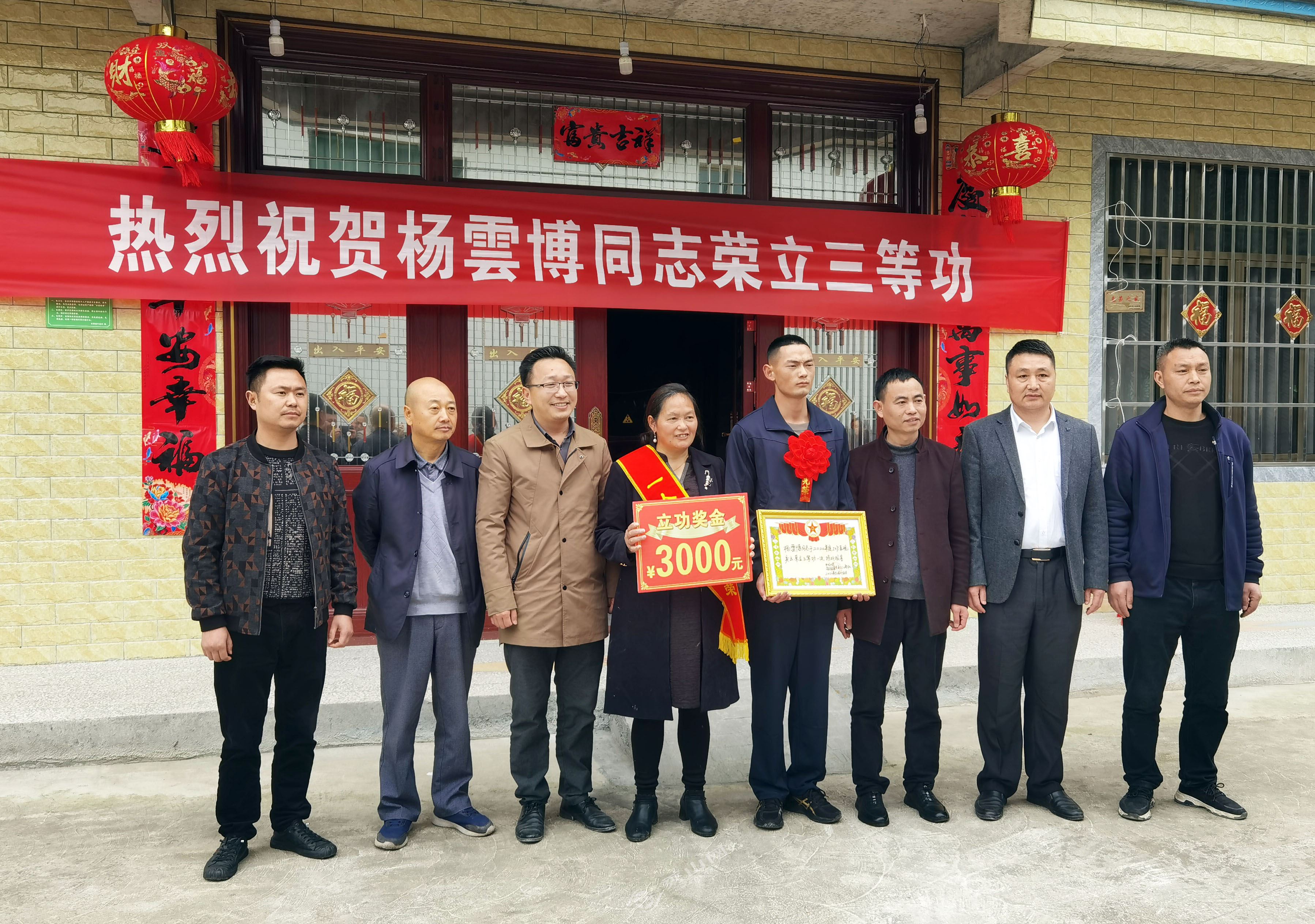 相關負責人前往石耶鎮平邑村楓香樹組楊雲博家中,為榮立三等功的楊雲博家庭發放獎狀及獎勵金,希望他再接再厲,獲得更多的榮譽。