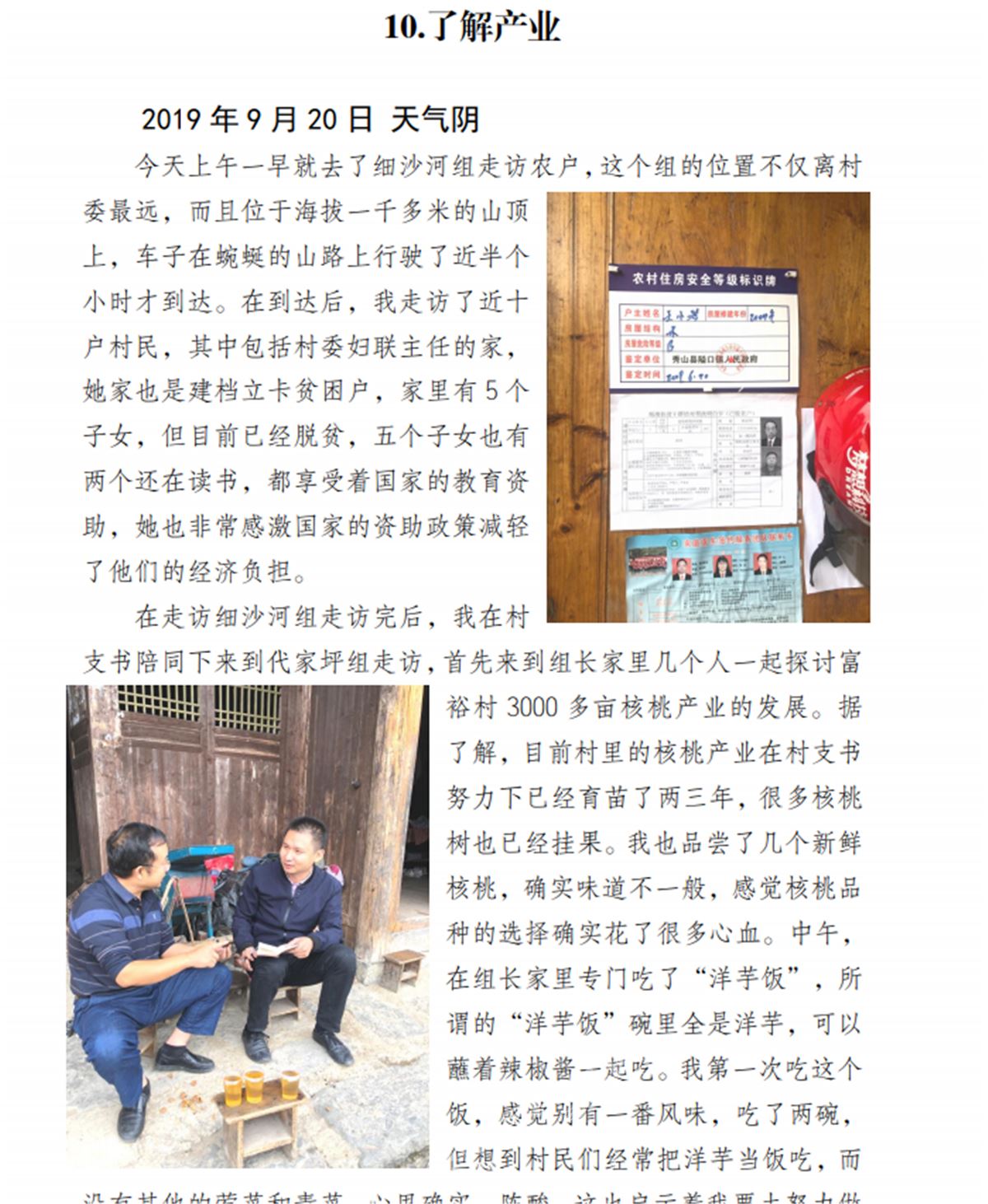 日記開頭部分記錄了作為一名駐村干部,賈曦從沙坪壩區大學城重慶商務職業學院學工部副部長、副教授到富裕村村里人的轉變,在短短的兩個月里,從最初的忐忑到篤定開展各項工作,賈曦將自己化身為引導富裕村民的導師,深入了解村里的情況,多次走訪村里的貧困群眾,引導村民共同做好核桃基地的管護工作,踏上脫貧致富的快車道。