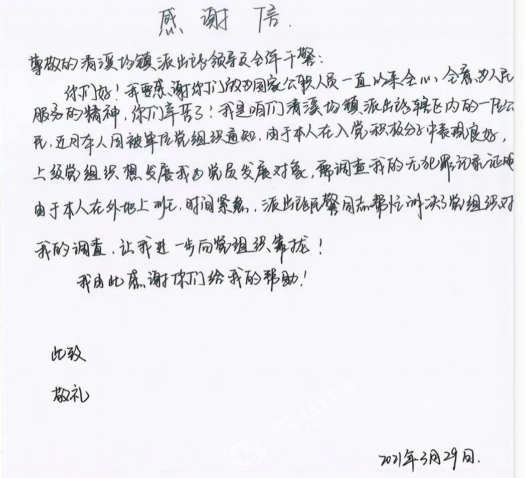 3月27日,清溪轄區居民石女士從工作地深圳撥打派出所電話咨詢辦理無違法犯罪記錄證明相關事宜,考慮到石女士從深圳往返一趟既耗時又耗錢,民警告知其僅需出具委托證明和傳真單位介紹信函即可予以辦理。收到其證明和信函后已是周末,民警仍然加班為她辦理好相關政審證明。拿到證明順利成為預備黨員的石女士備受感動,遂從千里之外寄來一封感謝信表達自己的謝意。
