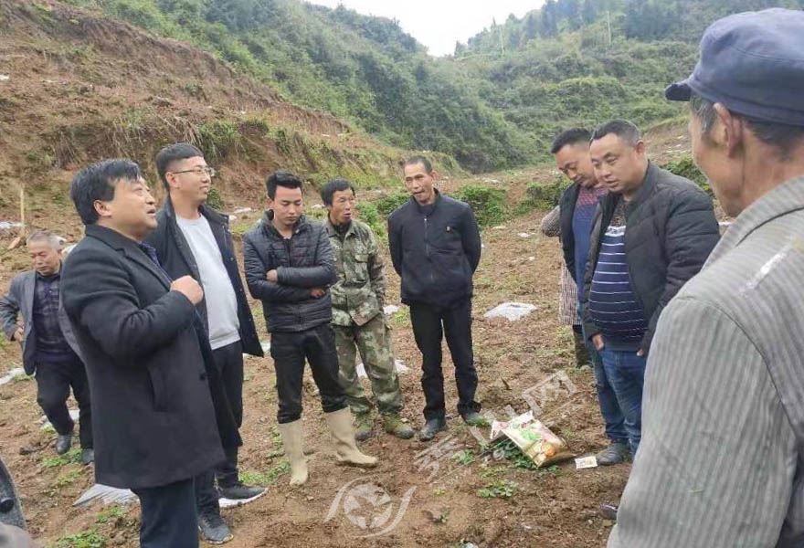 秀山網訊 “當前,山銀花管護最重要的是防止地下害蟲和施液態肥,保苗和促進幼苗快速成長”。4月8日,細雨蒙蒙,溪口鎮草果村黑石溝山銀花基地里,來自縣農業農村委的技術人員正在給新栽植山銀花的種植戶講解栽植后的管護技術。