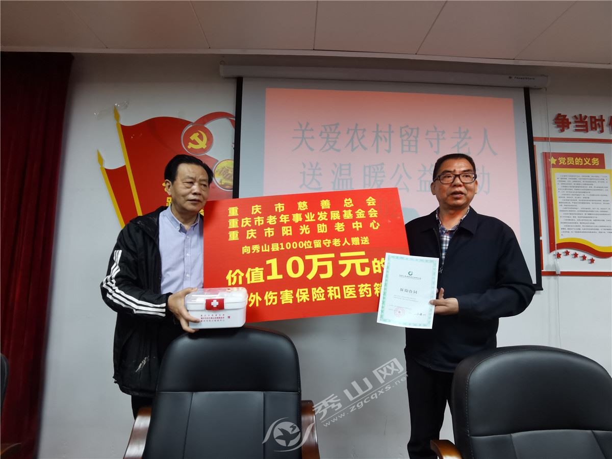 秀山網訊 學黨史 悟思想 辦實事 開新局。5月26日上午,由重慶市慈善總會、重慶市老年事業發展基金會、重慶市陽光助老中心聯合發起的《給農村老人的愛》公益活動走進我縣,為我縣隘口鎮、鐘靈鎮的1000余名留守老人贈送了價值10萬元的意外傷害保險和醫藥箱。
