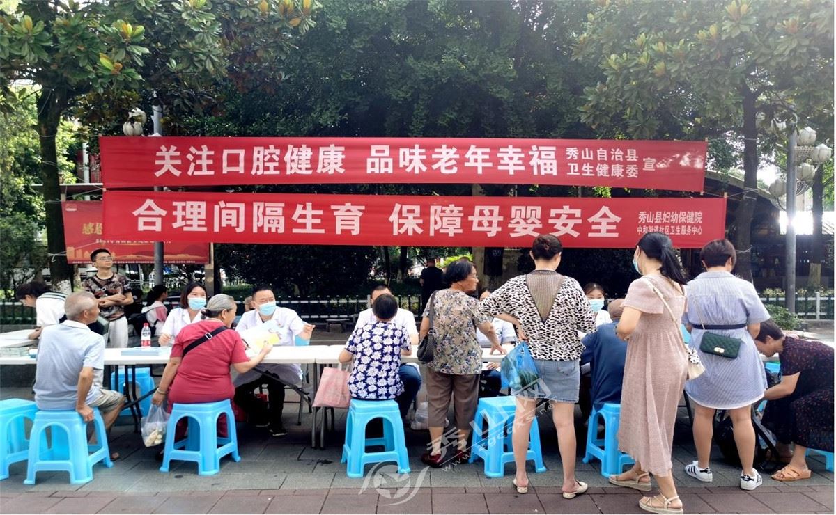 秀山網訊 7月12日,秀山縣衛生健康委組織縣人民醫院、縣中醫醫院、中和街道社區衛生服務中心等醫療衛生單位在花燈廣場開展“關注口腔健康,品味老年幸福”為主題的老年健康宣傳周活動。