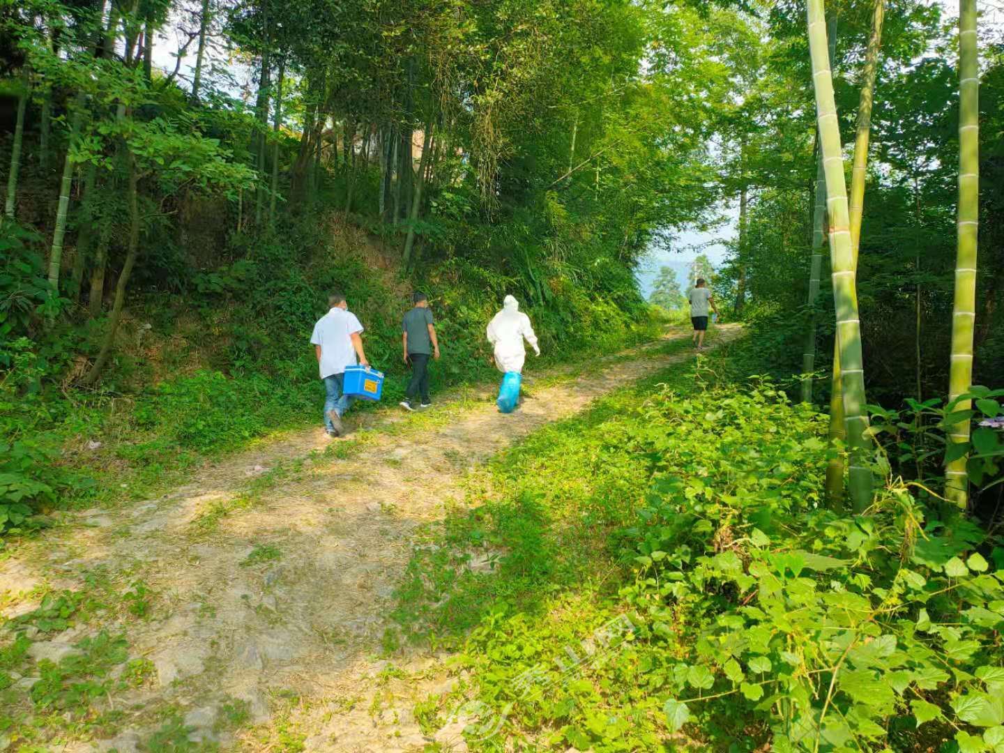 在山林里,車輛無法通行。負責采集樣本的醫護人員身著防護服,頂著炎日,步履艱辛地向群眾家中走去。