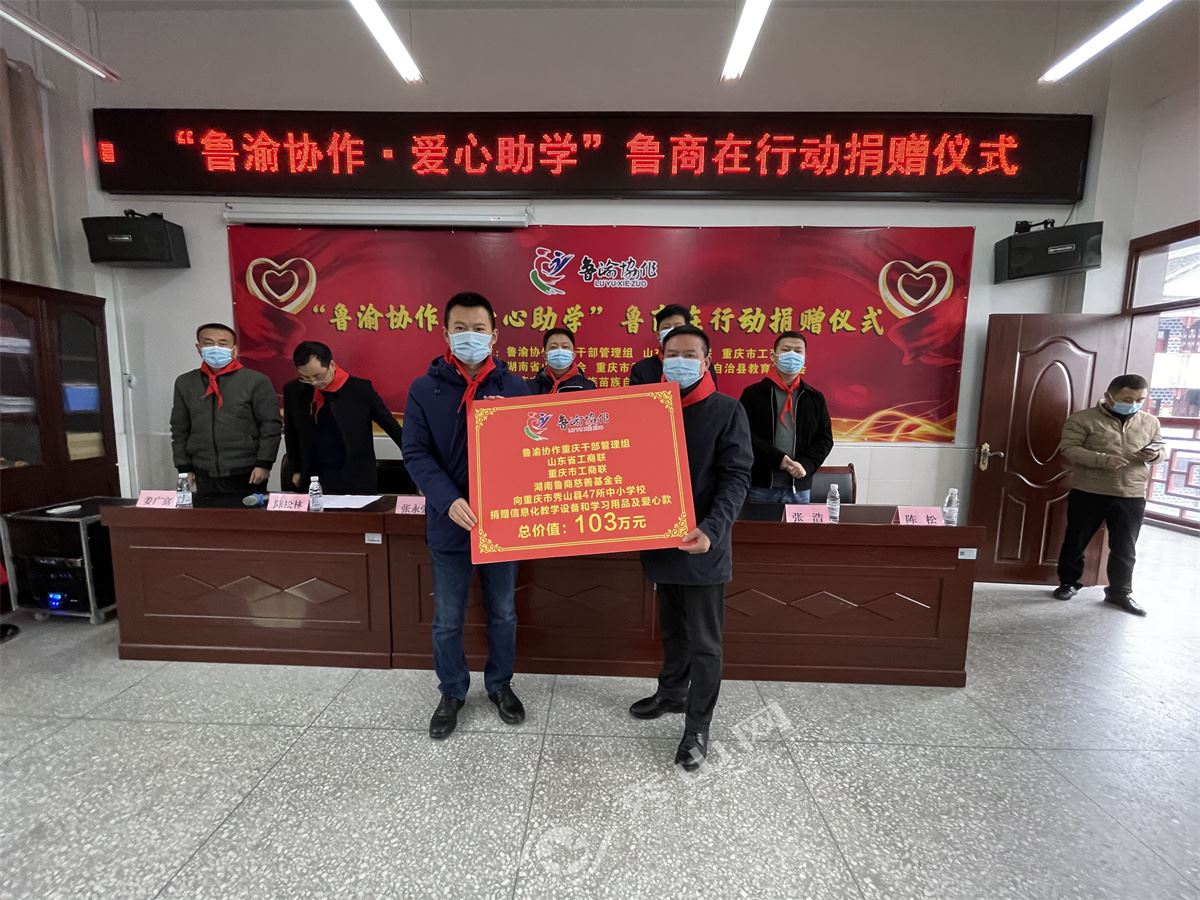 秀山網訊 1月18日,由山東省協作重慶掛職干部管理組、山東省工商聯、重慶市工商聯、湖南魯商慈善基金會聯合開展的“魯渝協作·愛心助學”魯商在行動愛心捐贈活動在梅江鎮民族小學舉行,為我縣47所中小學校捐贈價值102萬元的信息化教學設備和學習用品,以及1萬元愛心款。山東省協作重慶掛職干部管理組處長、山東省非公經濟組織黨委辦公室副主任張洋,縣人民政府黨組成員李軍,湖南省山東商會教育基金管委會執行主任張永強參加捐贈儀式。