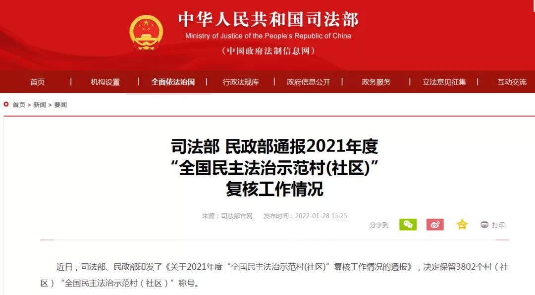 據悉,司法部、民政部自2004年在全國開展“民主法治示范村(社區(qū))”創(chuàng)建以來,共命名了八批“全國民主法治示范村(社區(qū))”,對促進農村基層民主法治建設發(fā)揮了積極作用。為強化動態(tài)管理,切實提升“全國民主法治示范村(社區(qū))”創(chuàng)建質量,司法部、民政部每兩年對“全國民主法治示范村(社區(qū))”進行一次復核。