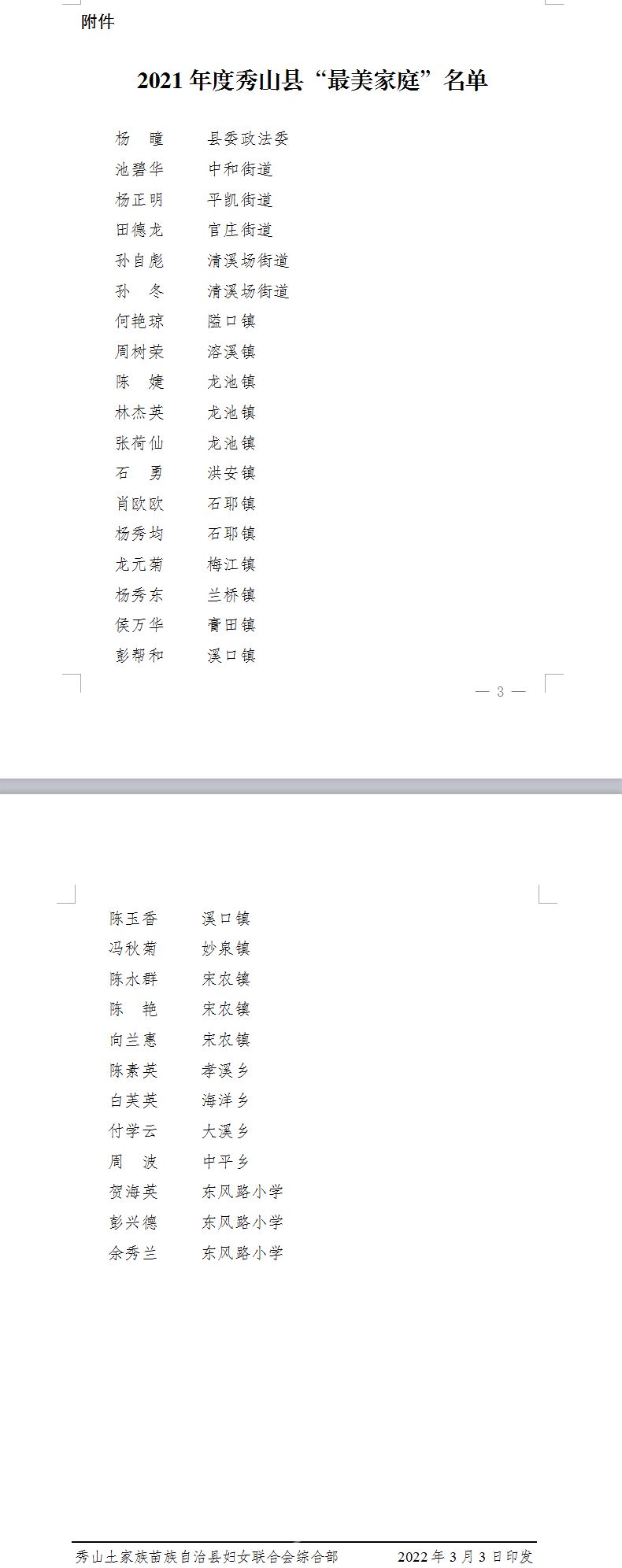 秀山網(wǎng)訊 日前,2021年度秀山縣“最美家庭”名單出爐,中和街道池碧華、平凱街道楊正明、官莊街道田德龍等30個(gè)家庭獲表彰。