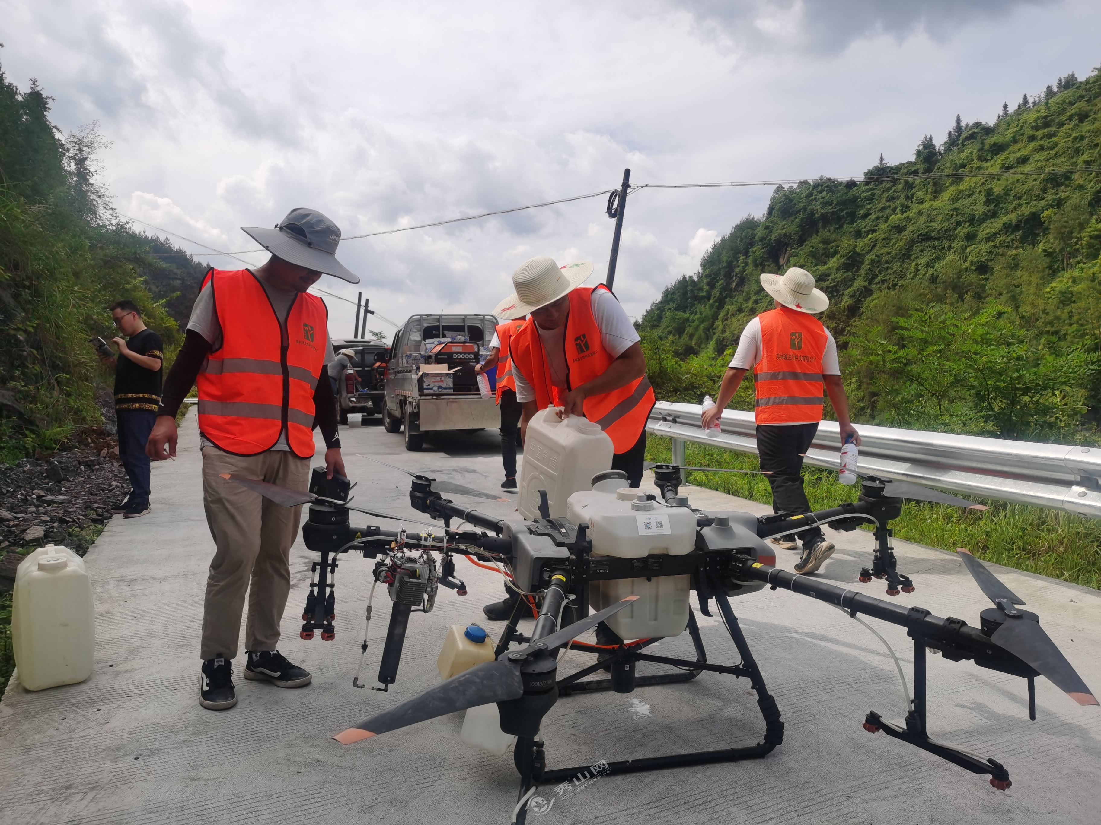秀山網訊 為保證森林生態安全,有效防控松材線蟲病傳播,昨天,我縣首次利用無人機對松材線蟲傳播媒介松褐天牛實行飛防作業。當天,縣林業局相關負責人和專業防治技術人員對雅江鎮桂坪村1500余畝松林進行了無人機噴藥防治工作。