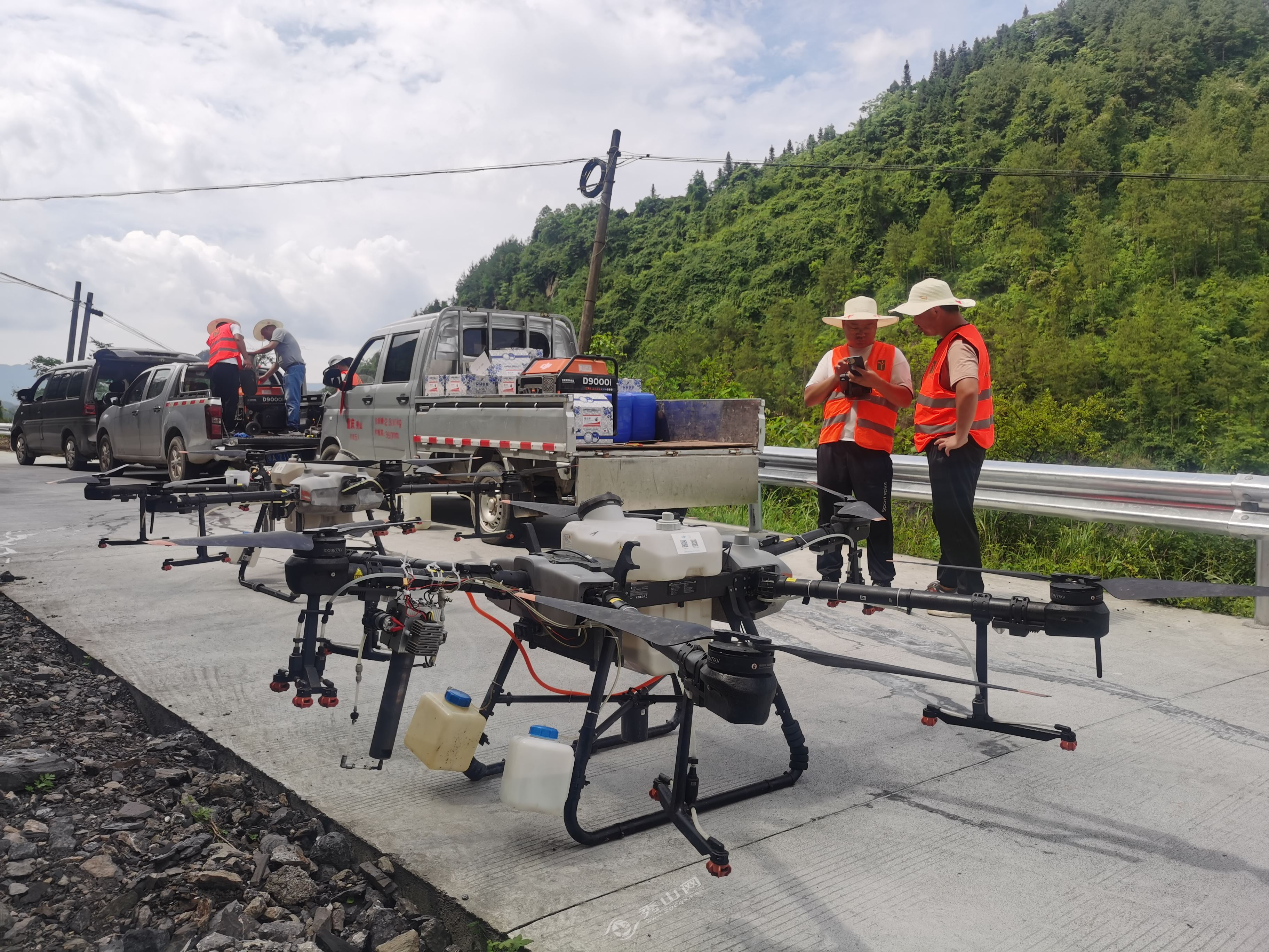 在防治現場,記者看見,經過工作人員的檢測、裝載藥水后,兩架無人機陸續升空,來回盤旋,按計劃有序進行無人機噴灑藥物防治作業。