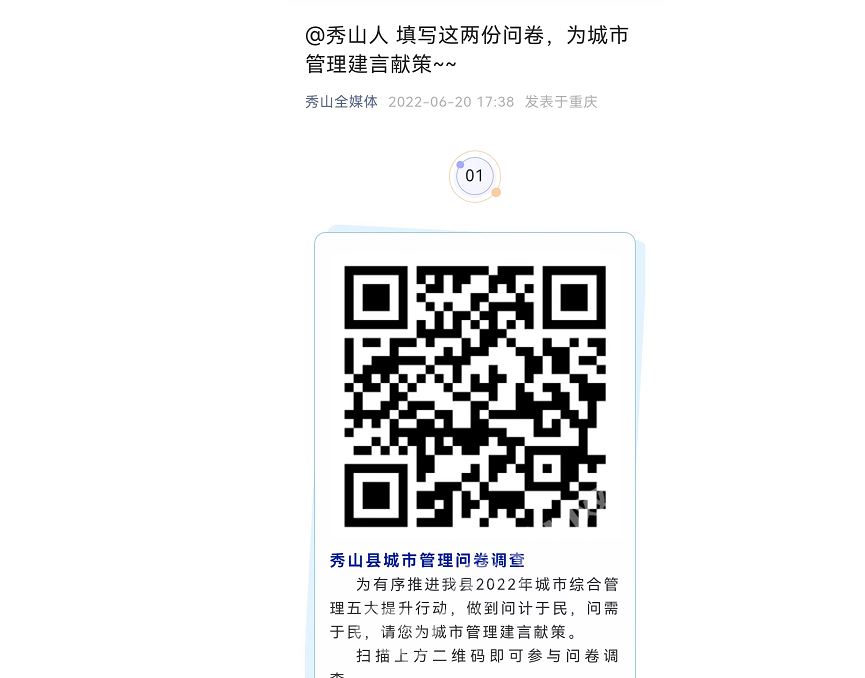 秀山網訊 為不斷提升城市管理水平,真正做到問計于民、問需于民、問效于民,努力營造干凈、整潔、有序的城市環境,連日來,縣城市管理局通過線上線下相結合的形式,廣泛開展問卷調查活動。