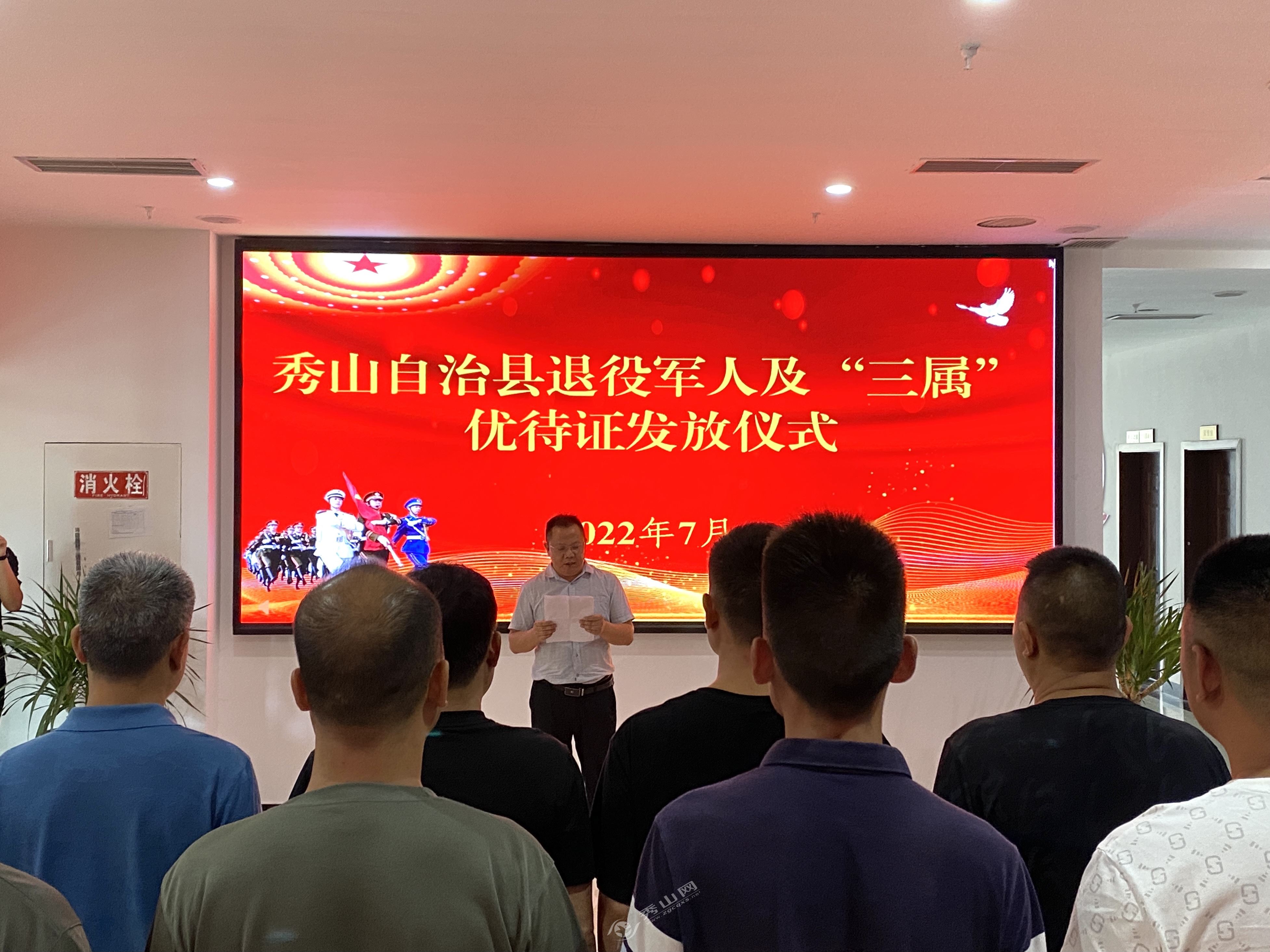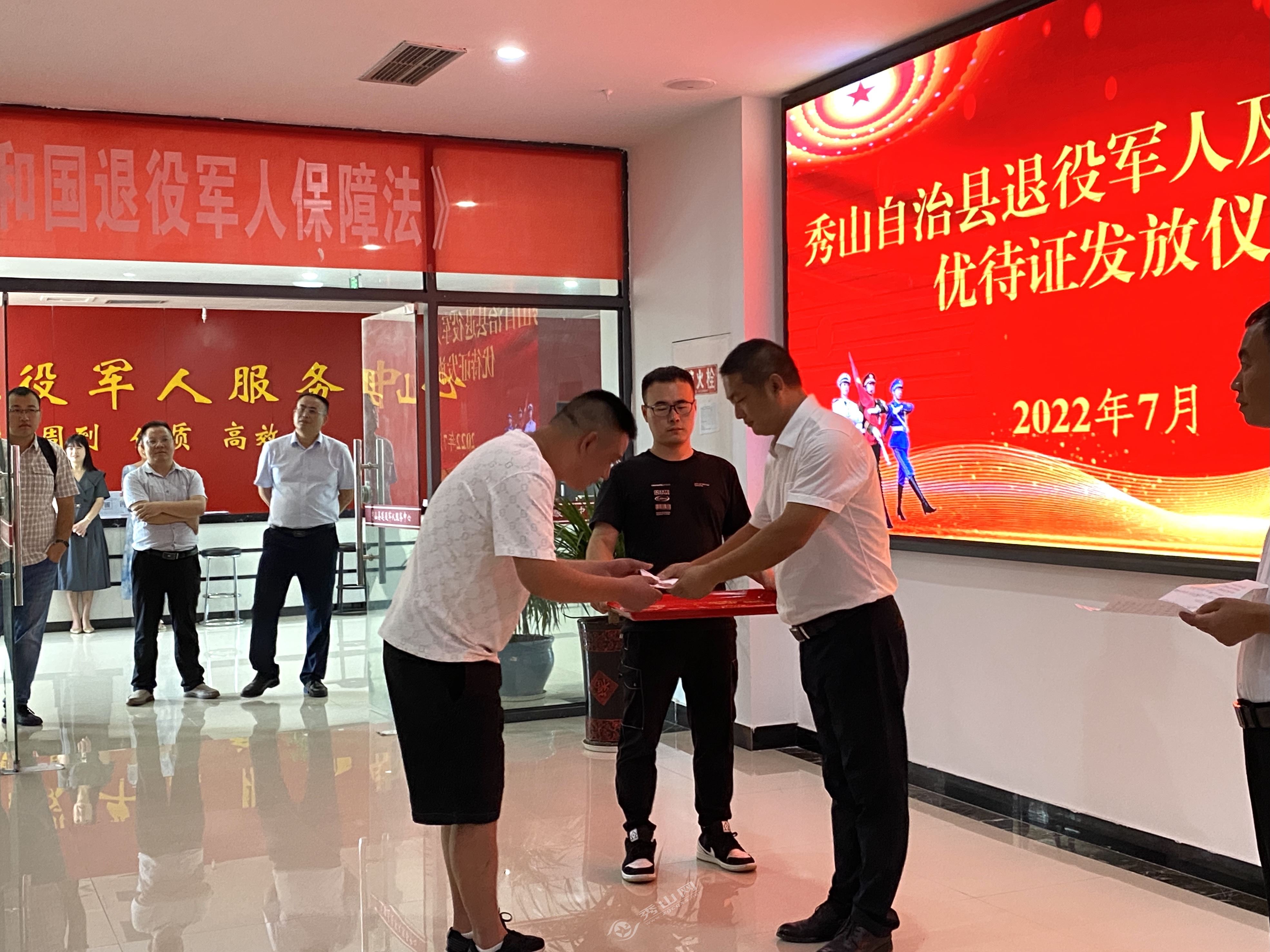 秀山網訊 7月22日上午,秀山縣退役軍人及三屬優待證發放儀式在縣退役軍人服務中心大廳舉行。儀式上,全體退役軍人奏唱中國人民解放軍軍歌,秀山郵政工作人員向大家介紹了優待證相關金融功能,縣退役軍人事務局黨組書記、局長楊文藝為首批20名退役軍人代表集中發放了優待證。