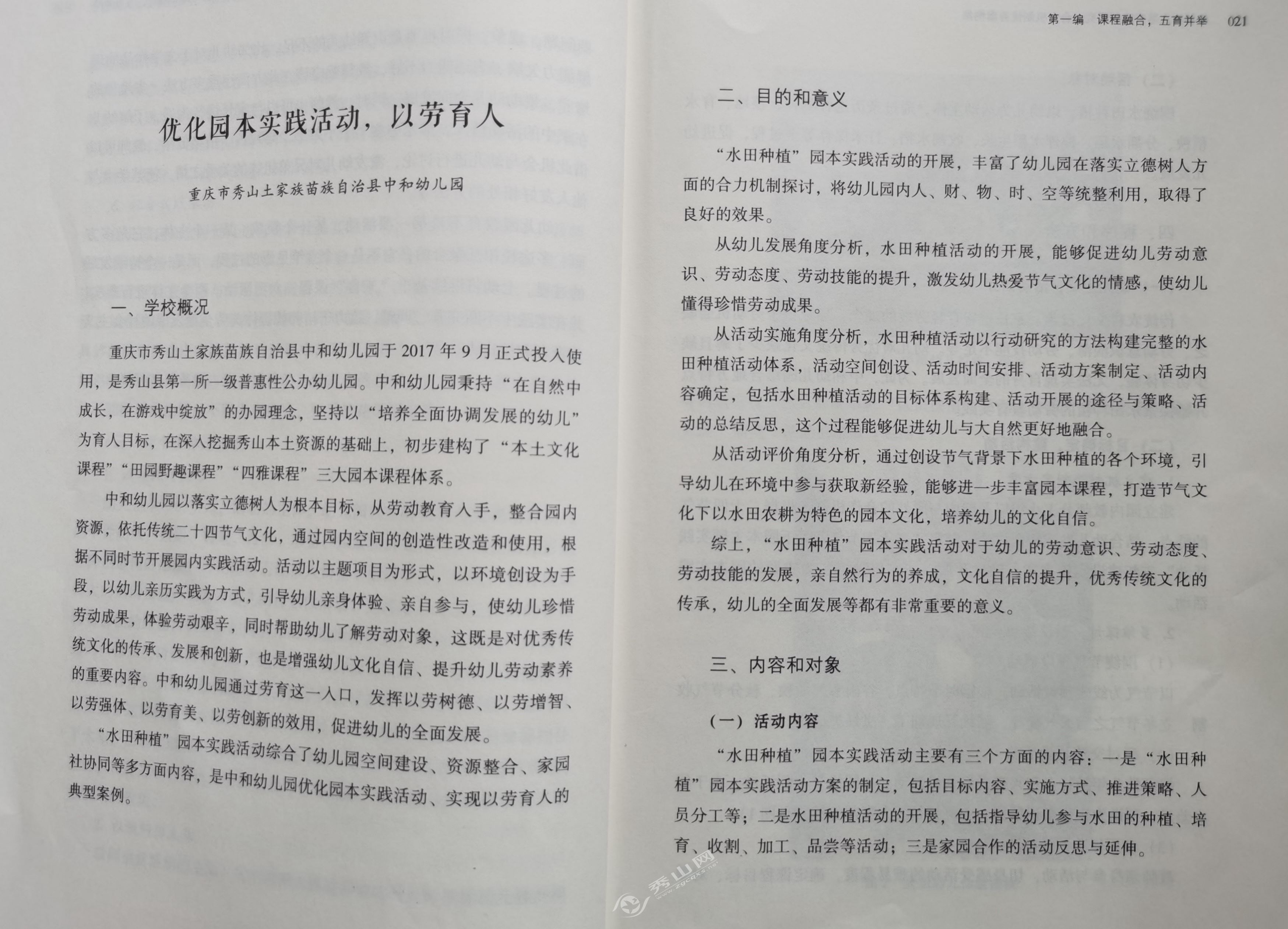 秀山網訊 記者從縣教委獲悉,日前,國家社科基金重大攻關項目“立德樹人的落實機制研究”成果發布,我縣中和幼兒園案例《優化園本實踐活動,以勞育人》成功入選“立德樹人落實機制研究”第一套叢書合力機制優秀案例集。