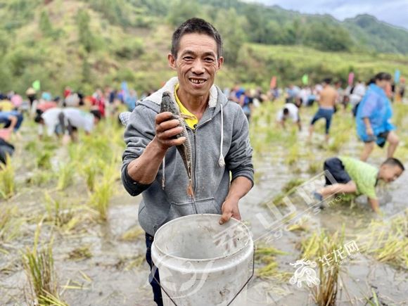 華龍網-新重慶客戶端記者在現場看到,一片金黃的稻田里,村民搭建起了慶祝豐收的舞臺。一邊是游客體驗稻田捉魚的樂趣,一邊是村民收割貢米的喜悅。