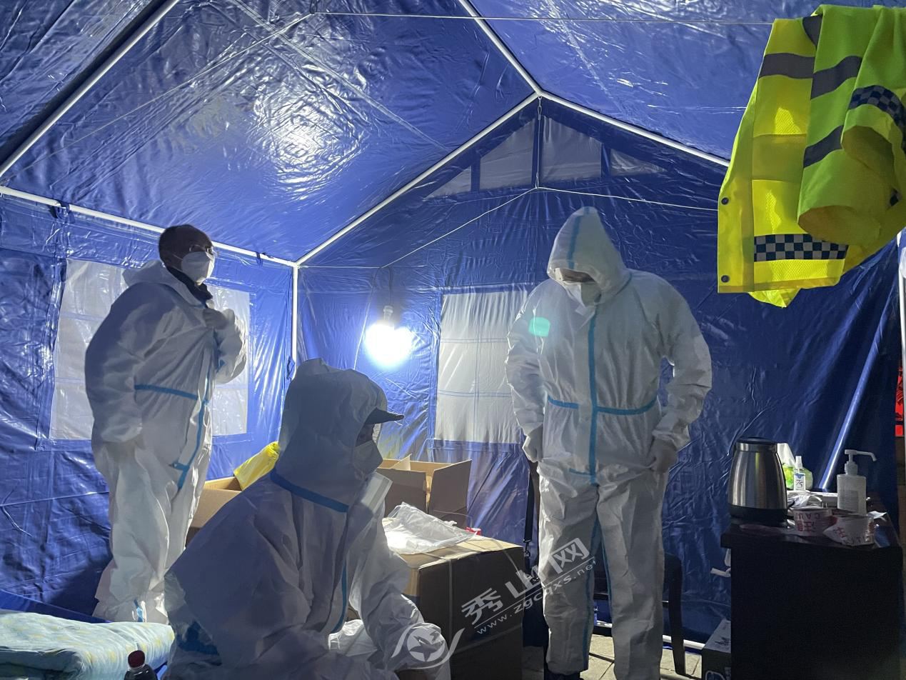 縣稅務局留金國際二期臨時管控點值班人員穿好隔離服做好換班準備。
