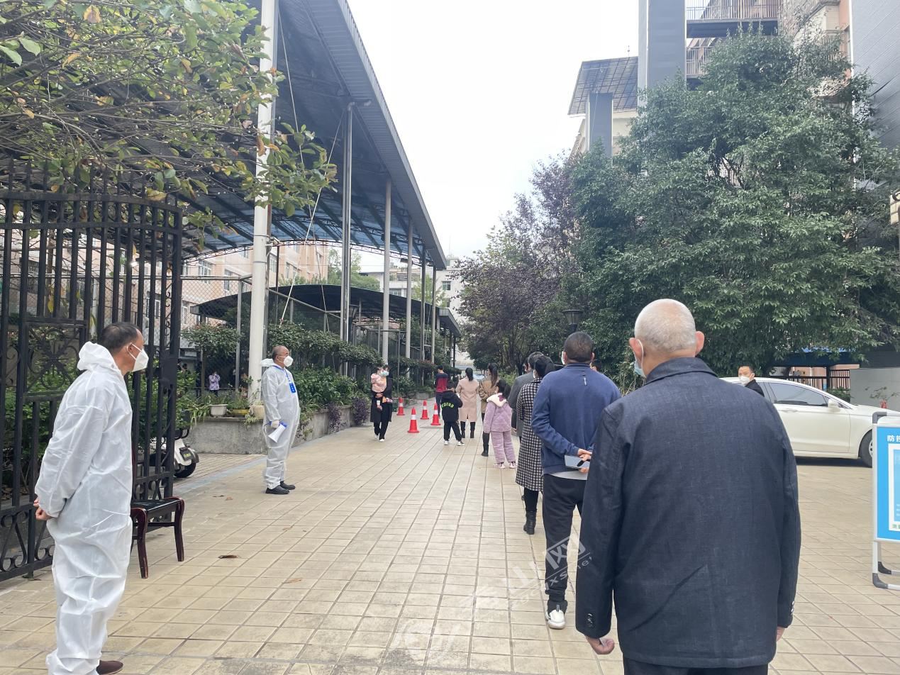 縣稅務局下沉社區志愿者在中和街道東風社區核酸采樣點維護現場秩序。