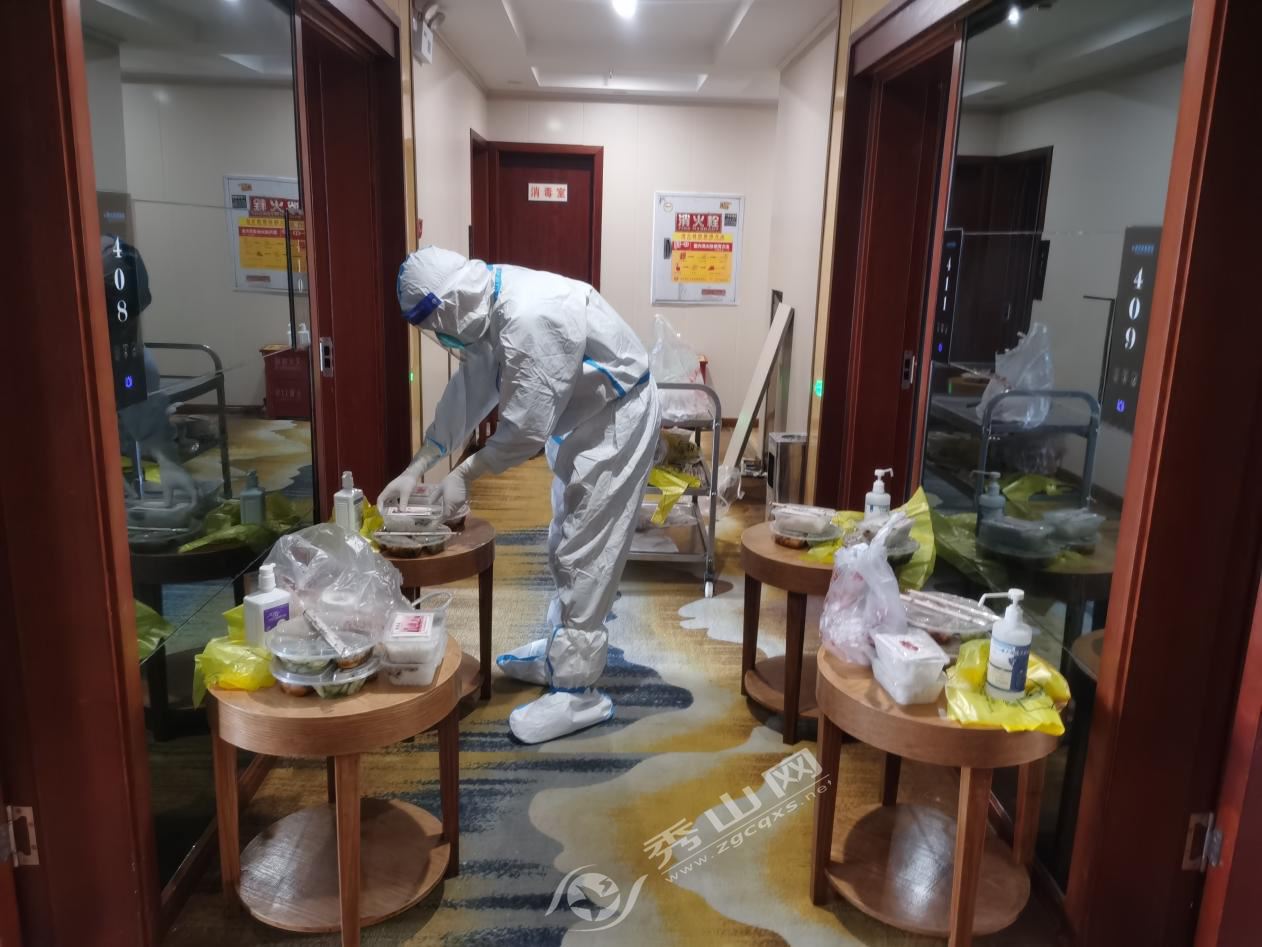 縣稅務局青年突擊隊員在陽光快捷酒店集中醫學觀察點隔離區為隔離對象配送晚餐。