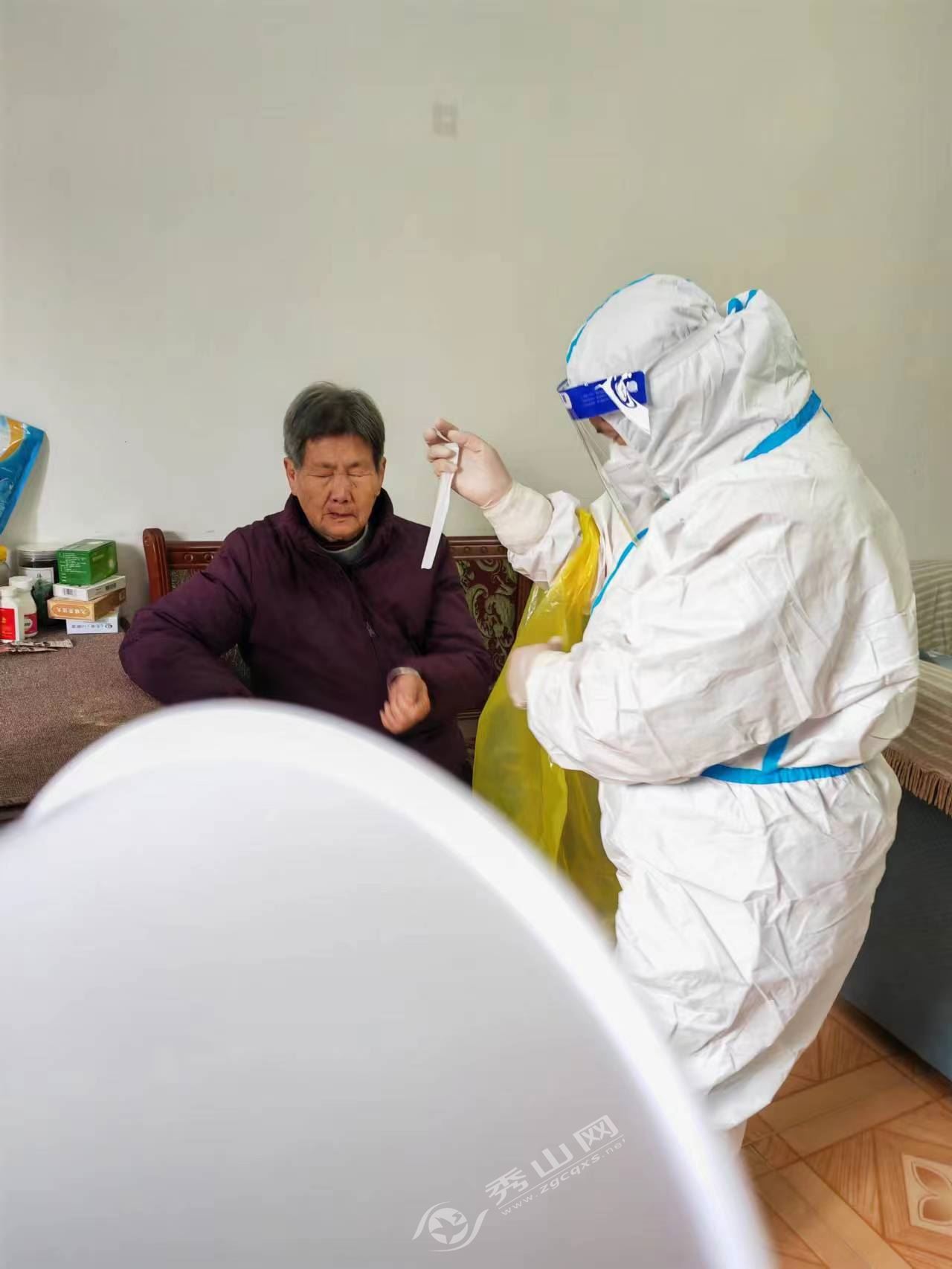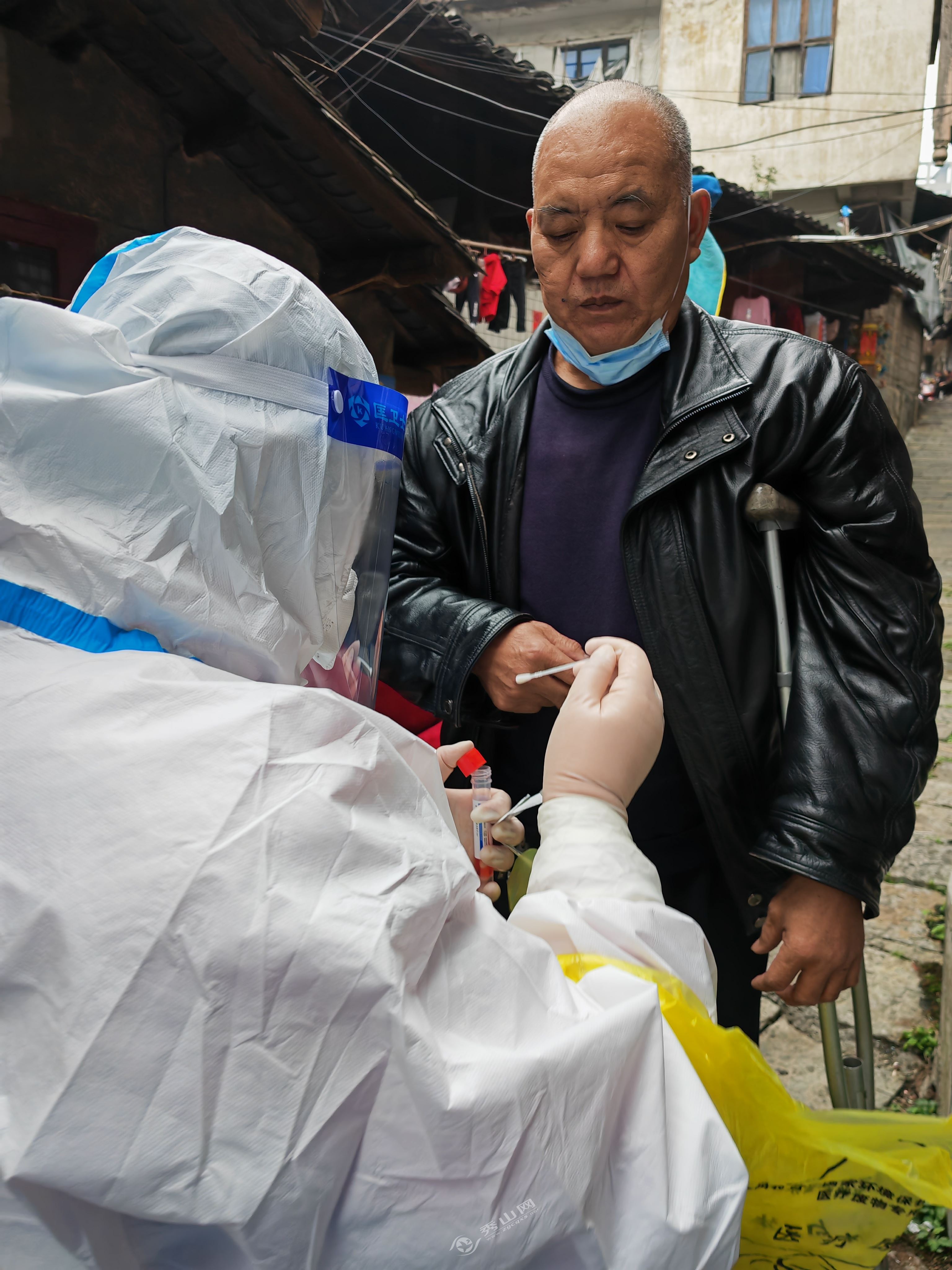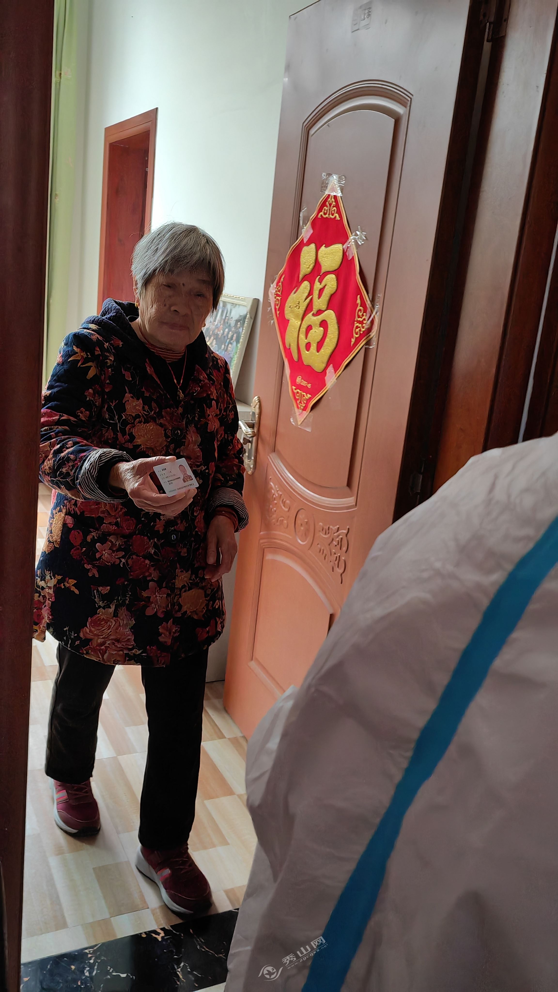 政法委工作人員田高陽配合社區工作人員上門給行動不便的老人采核酸