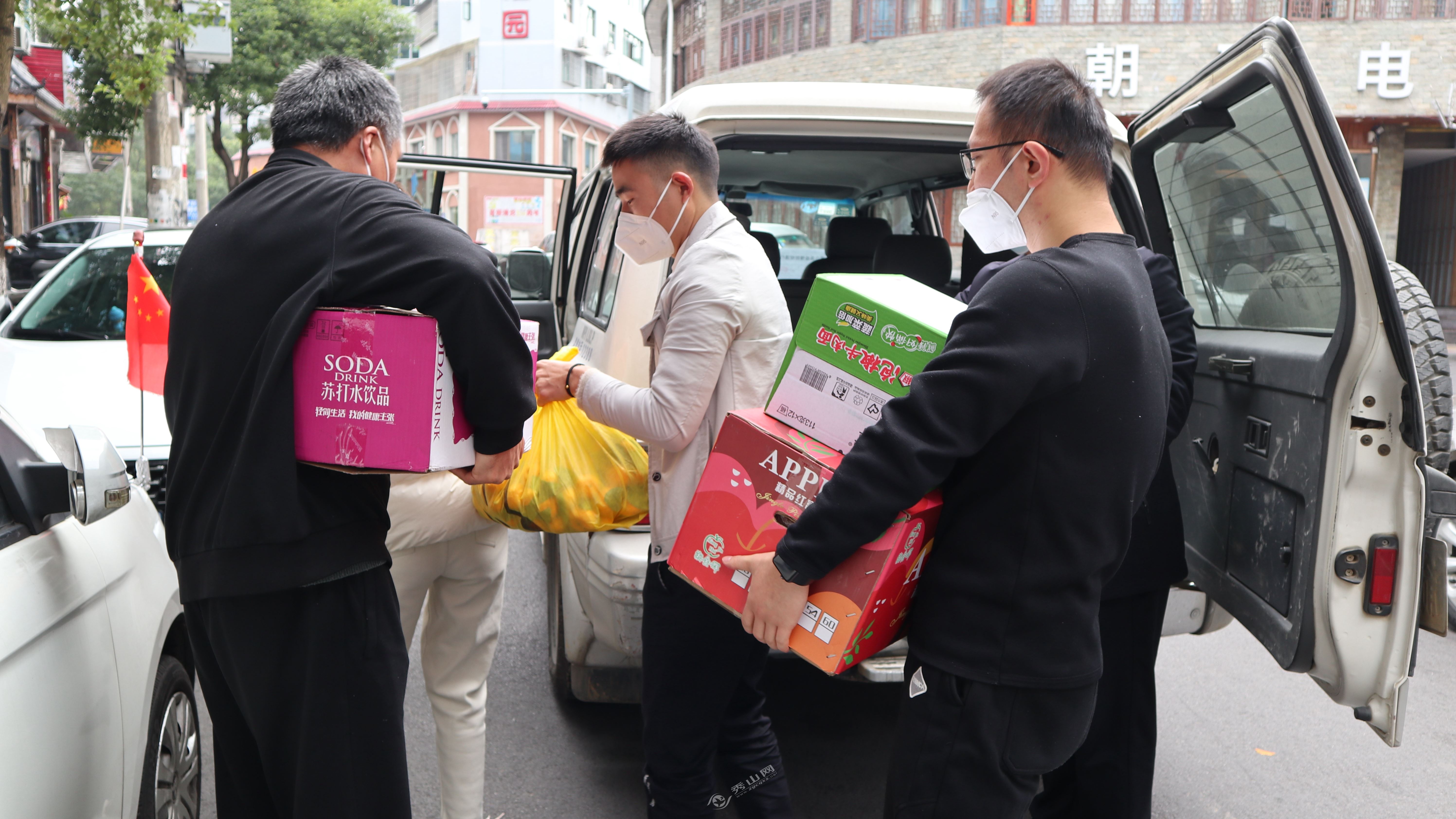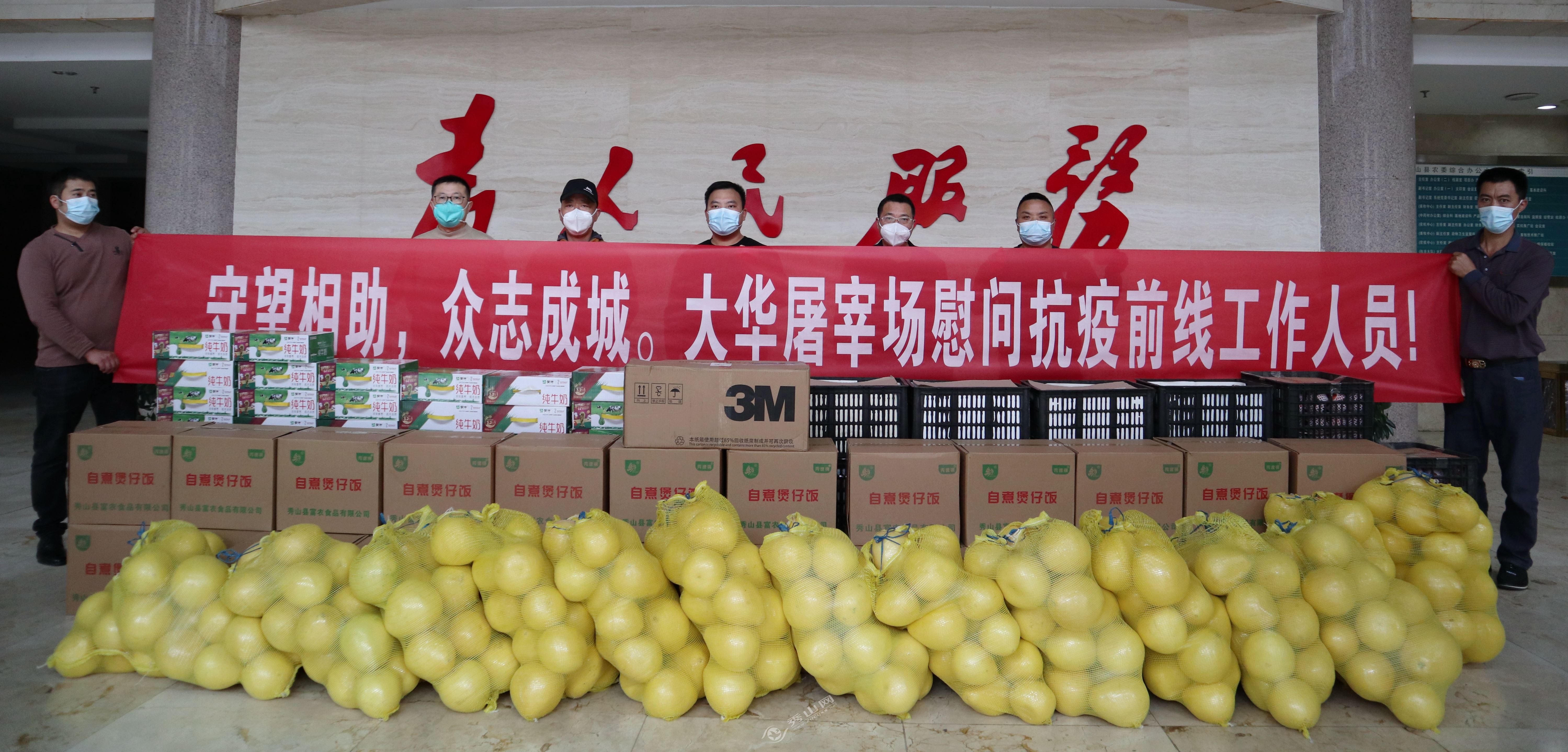 秀山縣大華生豬屠宰有限公司送去純牛奶、3M口罩、蘋果、柚子、自煮煲仔飯等物資。