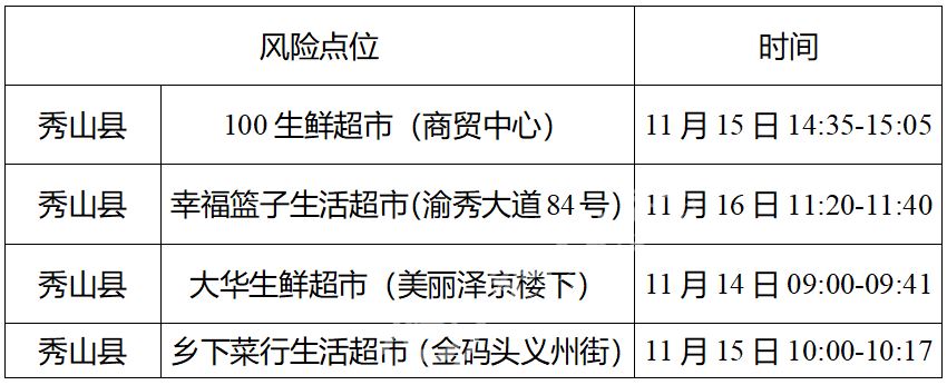 2022年11月20日,秀山縣新增報告137例無癥狀感染者?,F將在渝主要活動軌跡的風險點位和時間通告如下: