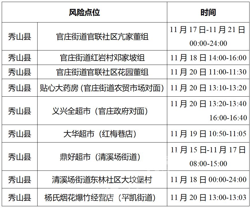 2022年11月21日,秀山縣新增報告60例無癥狀感染者。現將在渝主要活動軌跡的風險點位和時間通告如下: