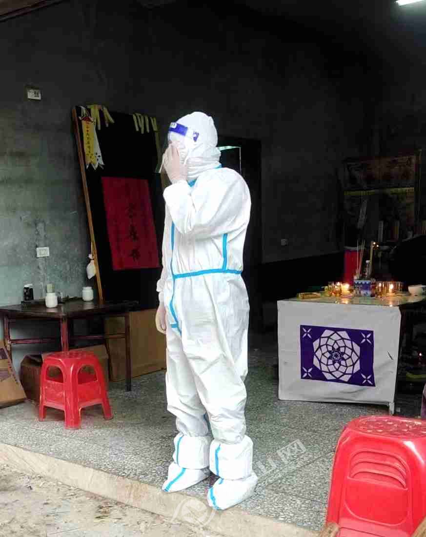 考慮到社區更多群眾的生命安全,強忍著內心的悲痛,喻鵬飛在專業防控人員專程陪同下,做好個人防護的情況下,于22日上午回家祭奠了母親。