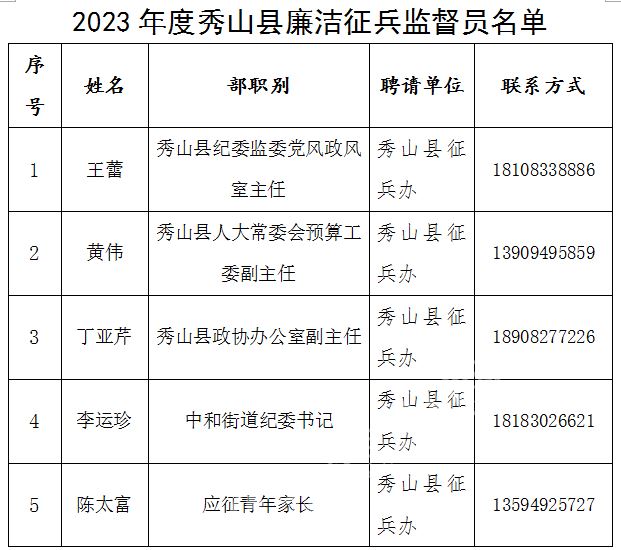 為了有效維護廣大應征青年的合法權益,進一步增強征兵工作透明度,確保征兵工作公平、公正、公開?,F將2023年秀山縣廉潔征兵監督員及監督舉報電話予以公示,歡迎社會各界對征兵工作進行監督。