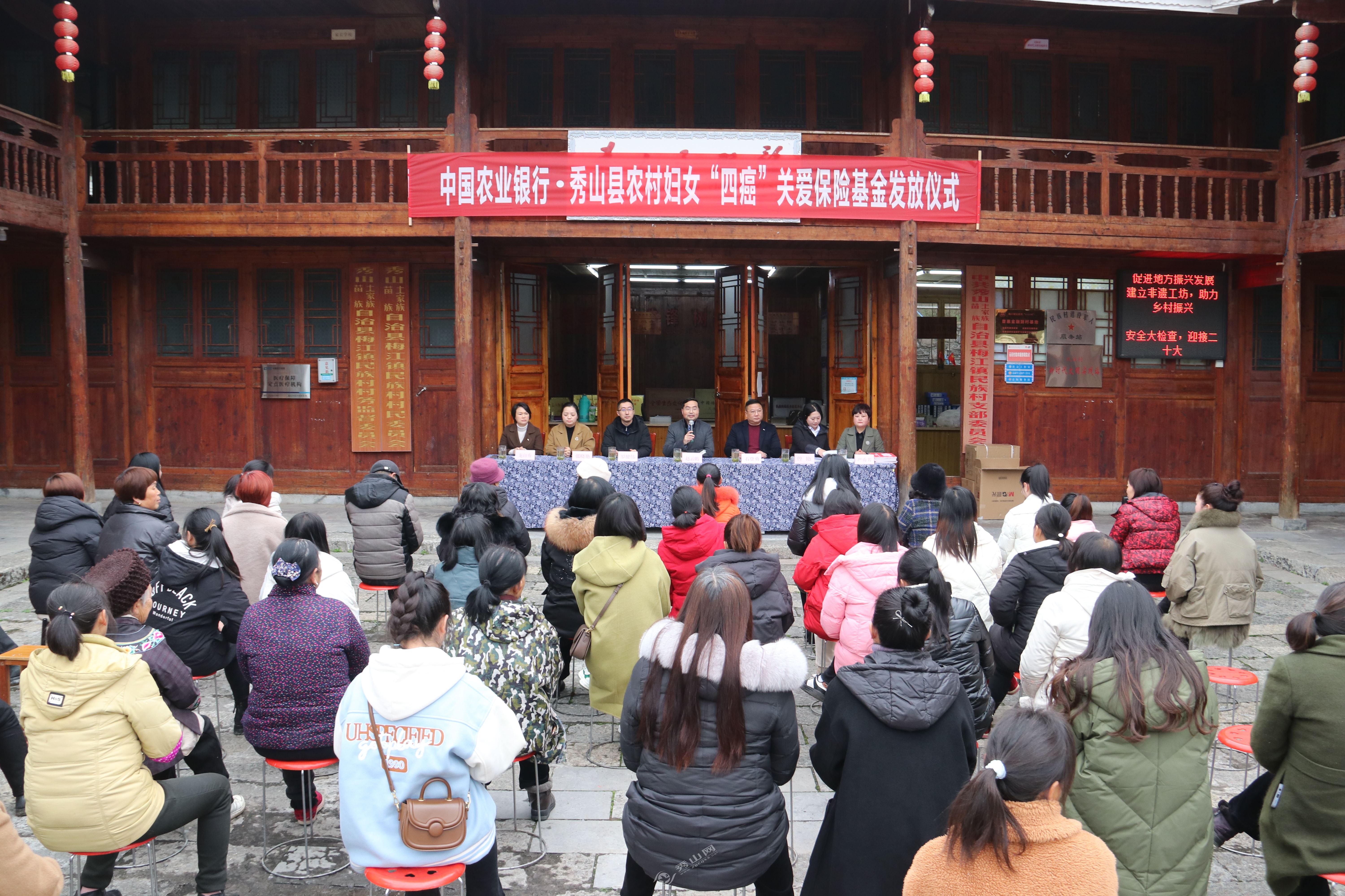 秀山網訊 為進一步做好秀山農村女性群體關愛幫扶工作,真正建立幫扶長效機制,有效鞏固脫貧攻堅成果。2月17日,由縣鄉村振興局、縣婦聯、中國農業銀行、中國人壽秀山支公司聯合主辦的中國農業銀行·秀山縣農村婦女“四癌”關愛保險基金發放儀式在梅江鎮民族村舉行。縣政府副縣長趙云鵬參加發放儀式。