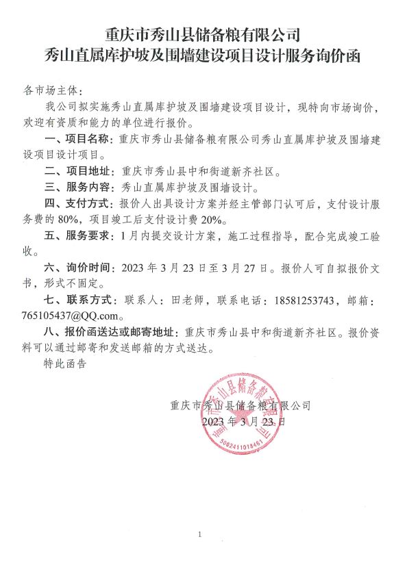 我公司擬實施秀山直屬庫護坡及圍墻建設項目設計,現特向市場詢價,歡迎有資質和能力的單位進行報價。