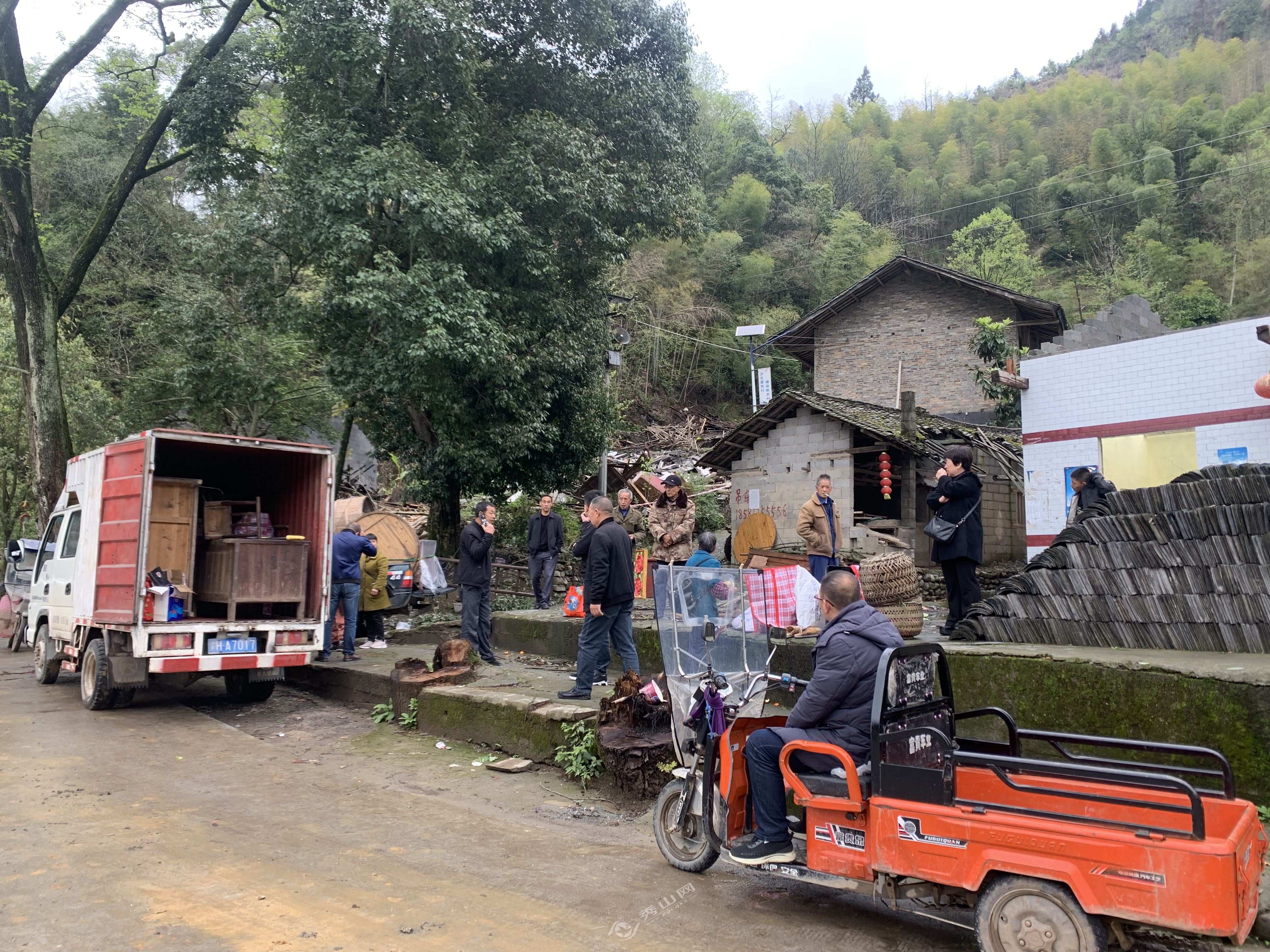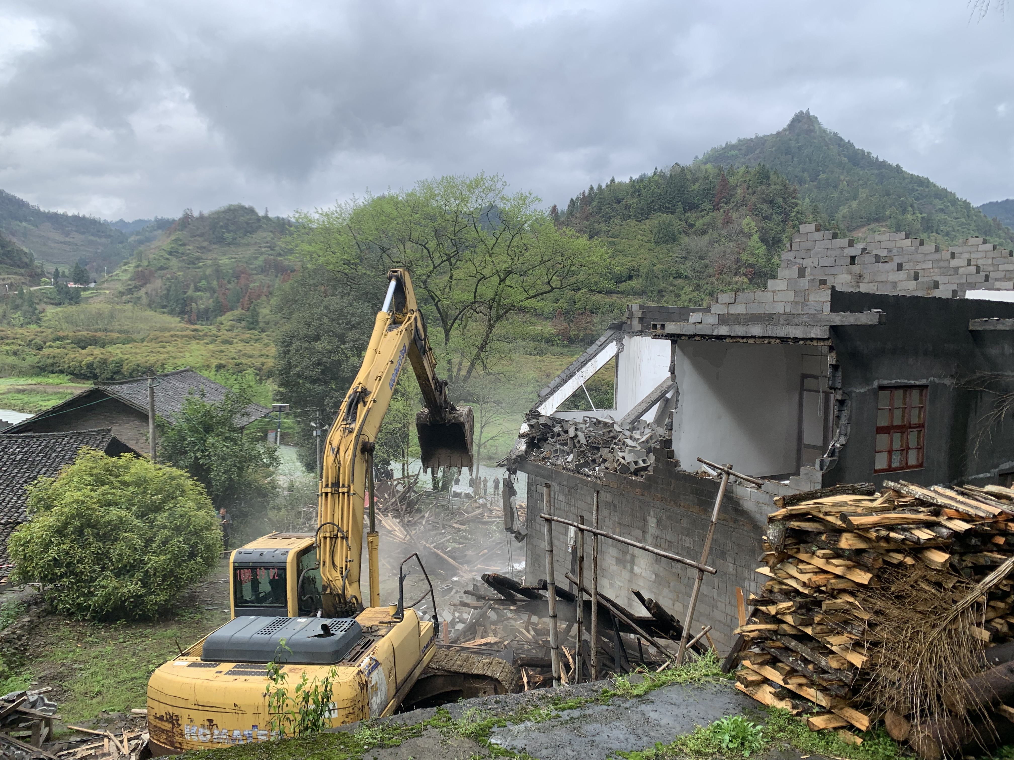 4月6日,在膏田鎮水田村沙田組,征收房屋拆除工作正如火如荼展開,挖掘機正揮舞著鐵臂,在轟隆隆的作業聲中,對已清空的房屋進行拆除,村民們在工作人員的幫助下有序地打包行李上車,貨運車輛在村道內來來往往,把村民的生產生活用品一車一車送到安置點。
