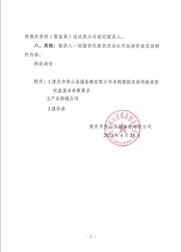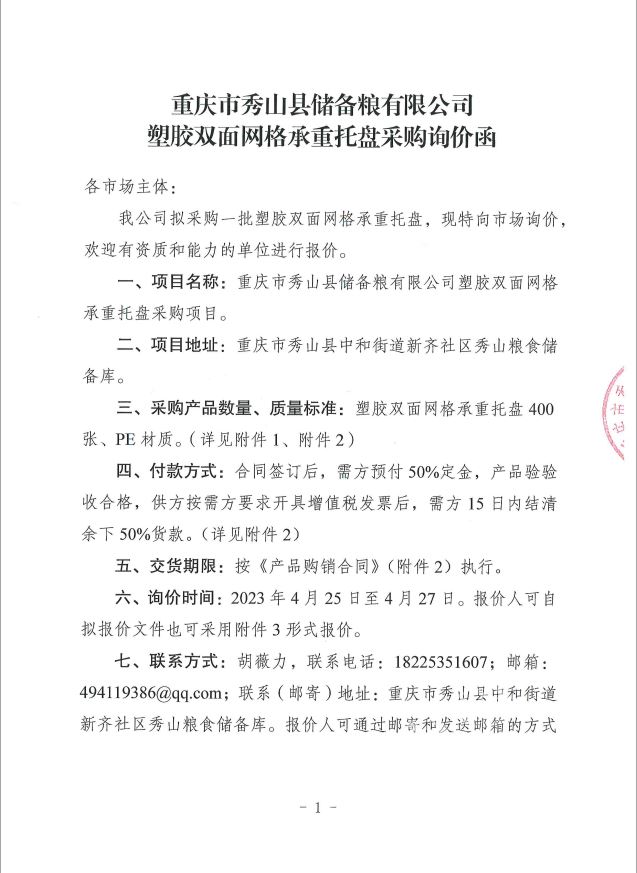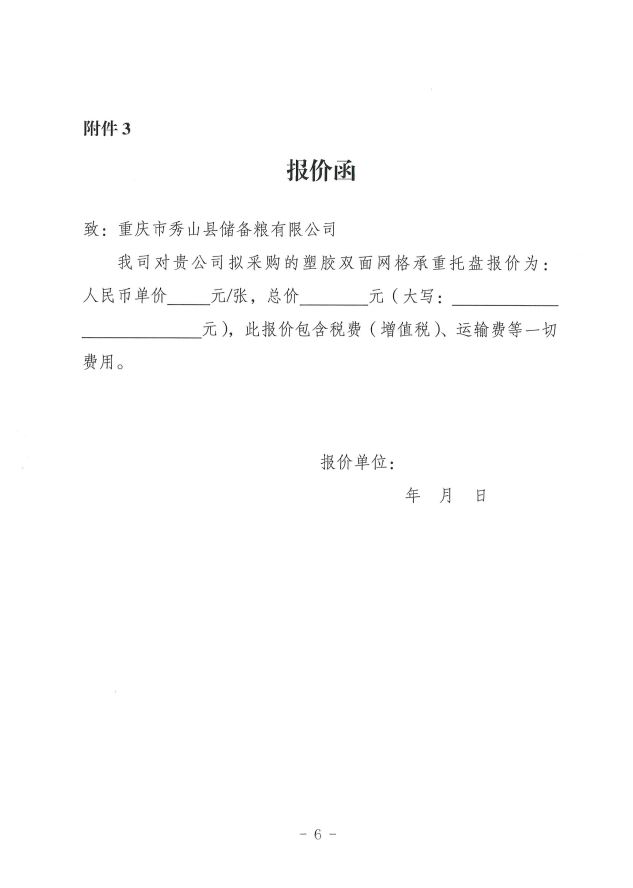 一、項目名稱:重慶市秀山縣儲備糧有限公司塑膠雙面網格承重托盤采購項目。
