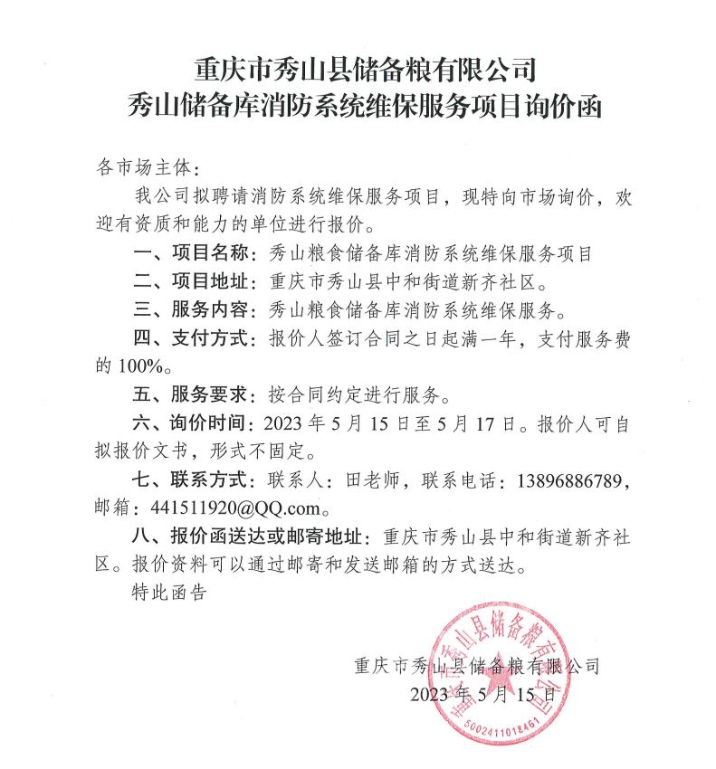 八、報價函送達(dá)或郵寄地址:重慶市秀山縣中和街道新齊社區(qū)。報價資料可以通過郵寄和發(fā)送郵箱的方式送達(dá)。