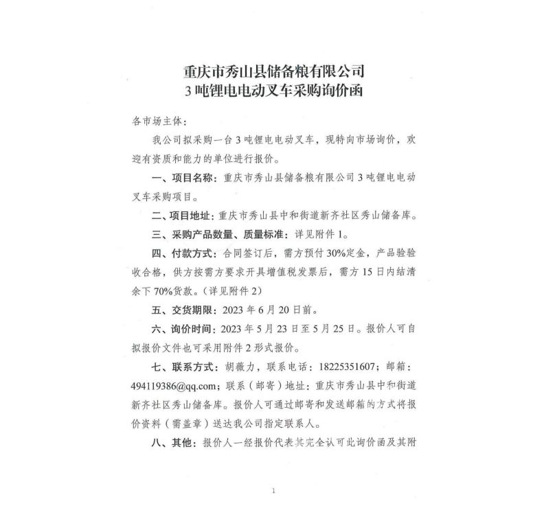 七、聯系方式:胡薇力,聯系電話:18225351607;郵箱:494119386@qq.com;聯系(郵寄)地址:重慶市秀山縣中和街道新齊社區秀山儲備庫。報價人可通過郵寄和發送郵箱的方式將報價資料(需蓋章)送達我公司指定聯系人。