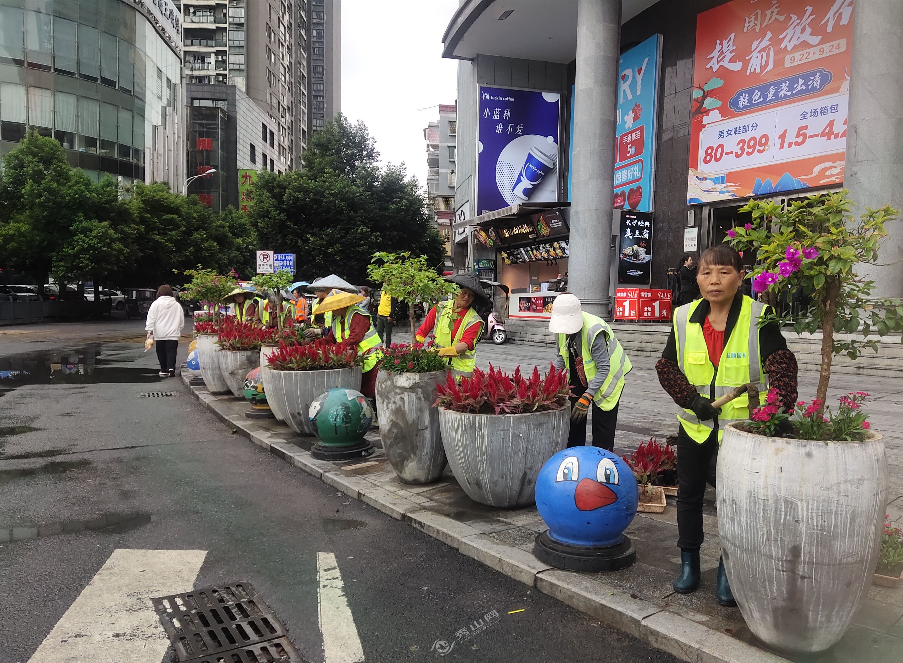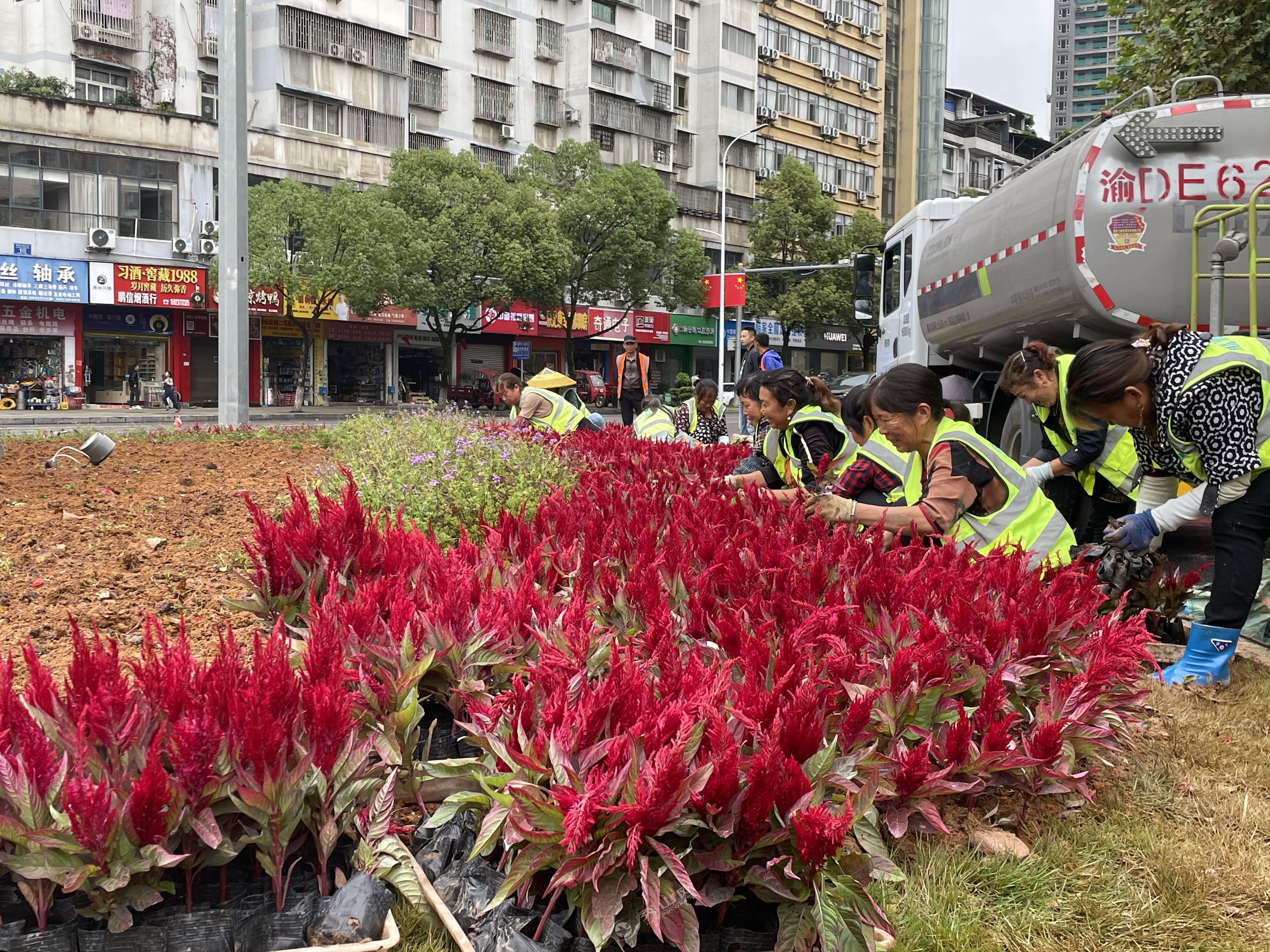 9月24日,在渝秀大道交通島、武陵廣場、中和廣場等城區主要路口和廣場,記者看到,綠化工人們正在忙著擺放鮮花,雞冠花、大花石竹等造型各異的花兒爭奇斗艷,錯落有致,以絢麗的色彩和美好的寓意共同為祖國慶生。