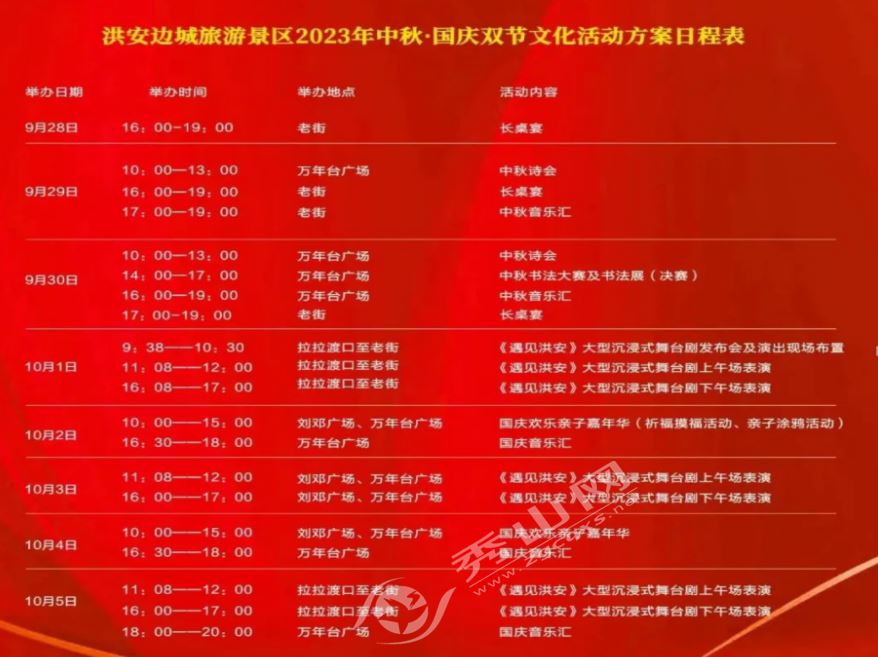 其中9月29日至30日將開展“共話團圓時·圓夢初戀里”主題中秋活動;10月1日、3日、5日將展演邊城文化、紅色歷史文化主題沉浸式舞臺劇;10月1日至5日將開展國慶歡樂親子嘉年華活動。
