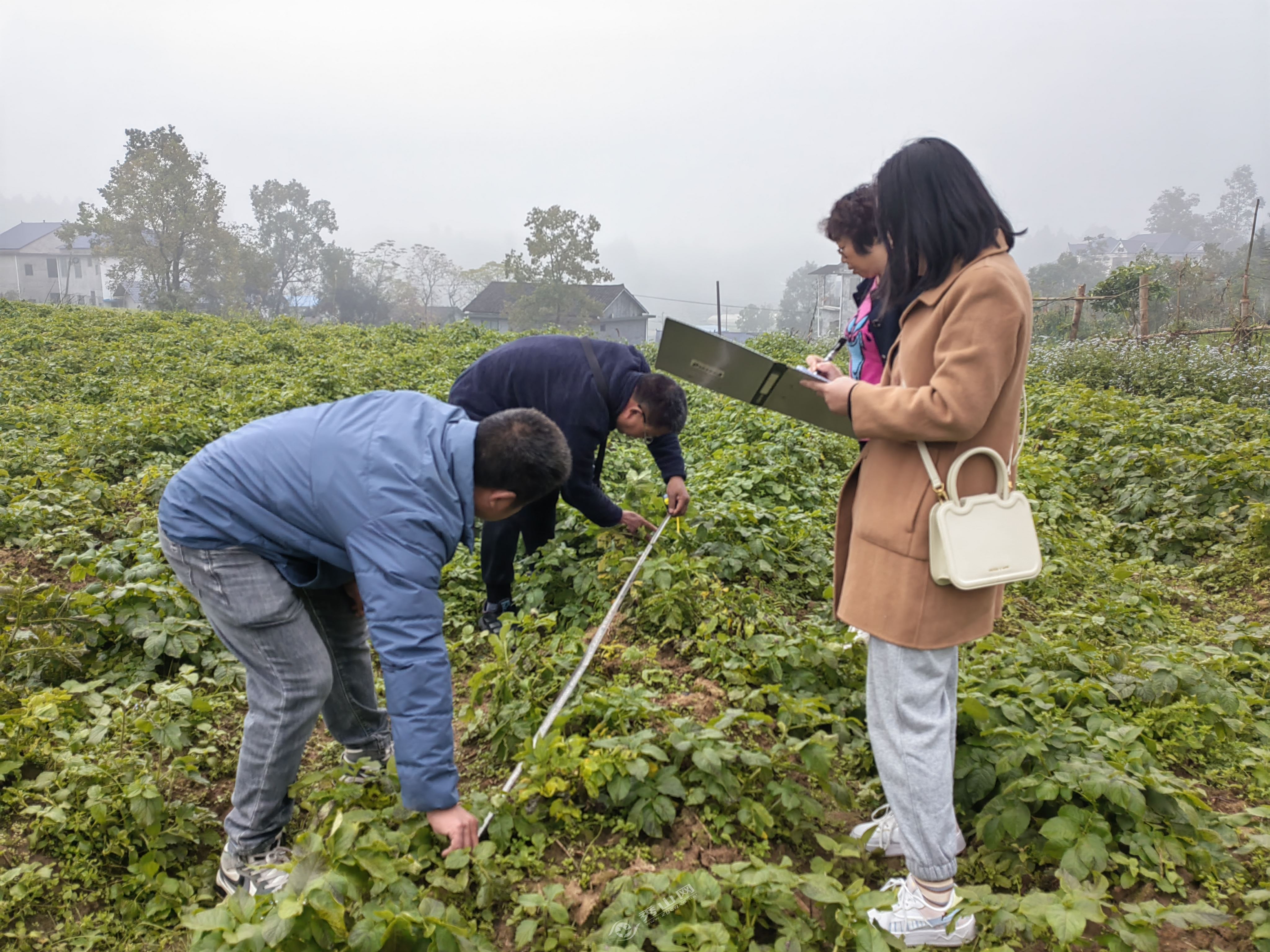 圖為縣農(nóng)技中心副主任許洪富在峨溶鎮(zhèn)龍?zhí)翛_村開展馬鈴薯測(cè)產(chǎn)