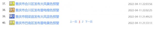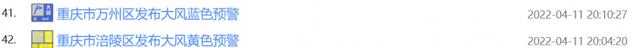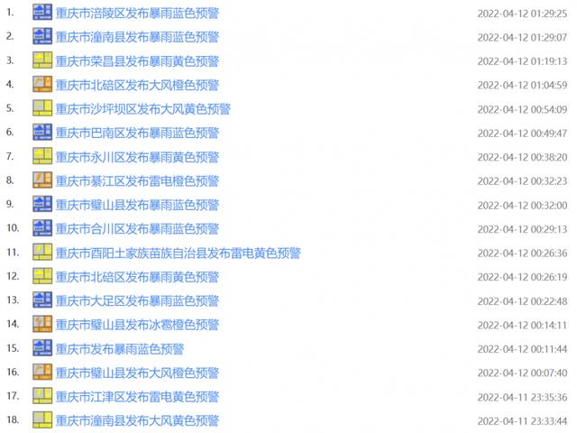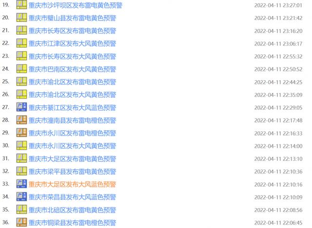 从4月11日晚八点到4月12日深夜一点半,重庆多个区县发布了总计42个气象预警,内容涵盖大风、暴雨、雷电、冰雹等。