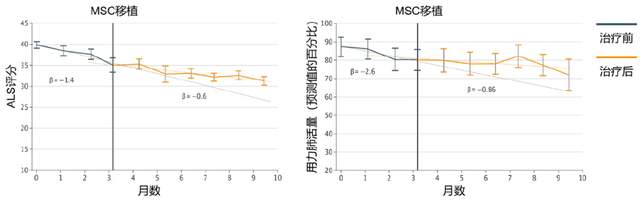 结果表明,14位受试者耐受良好,用力肺活量的恶化速度减缓,渐冻症的功能评分下降减慢(图3),治疗后6个月病程进展至少改善了25%,显示了细胞移植在治疗渐冻症时的巨大潜力。