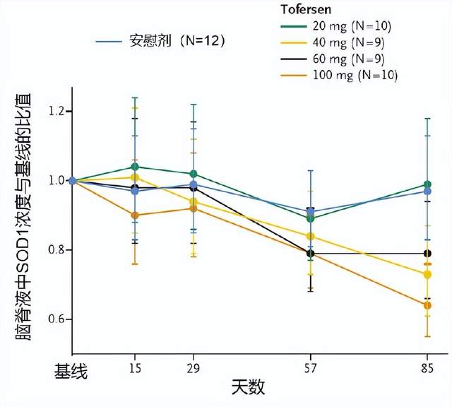 根据最新成果来看,Biogen(渤健)公司开发了针对SOD1的ASO药物Tofersen,临床I/II试验表明,Tofersen 可降低脑脊液中SOD1蛋白的浓度(图4)。