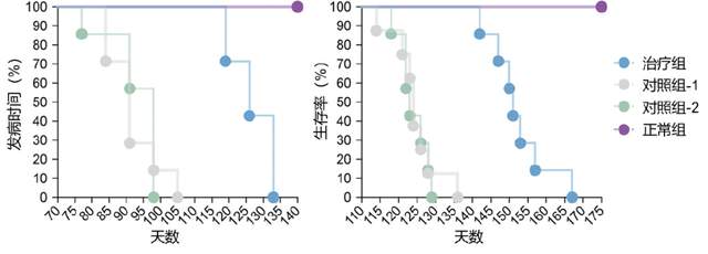 经治疗的小鼠运动神经元得到保存,运动功能得到改善,发病时间延迟37%,生存率提高25%(图6)。